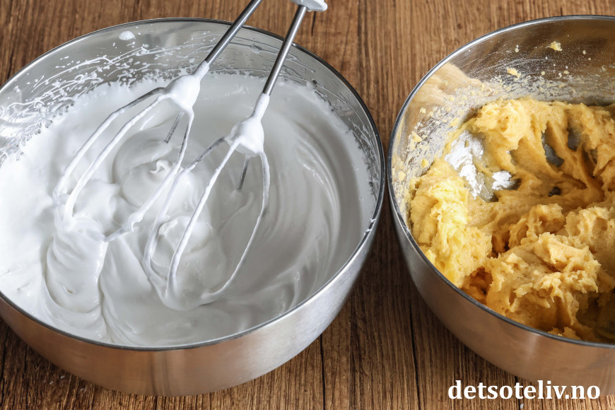 I en annen bolle piskes eggeplommer, maisenna og sukker lett sammen.