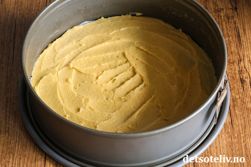 Ha bakepapir i bunnen på 2 runde kakeformer som er 24 cm i diameter (se tips). Smør deigen tynt utover i bunnen på formene.