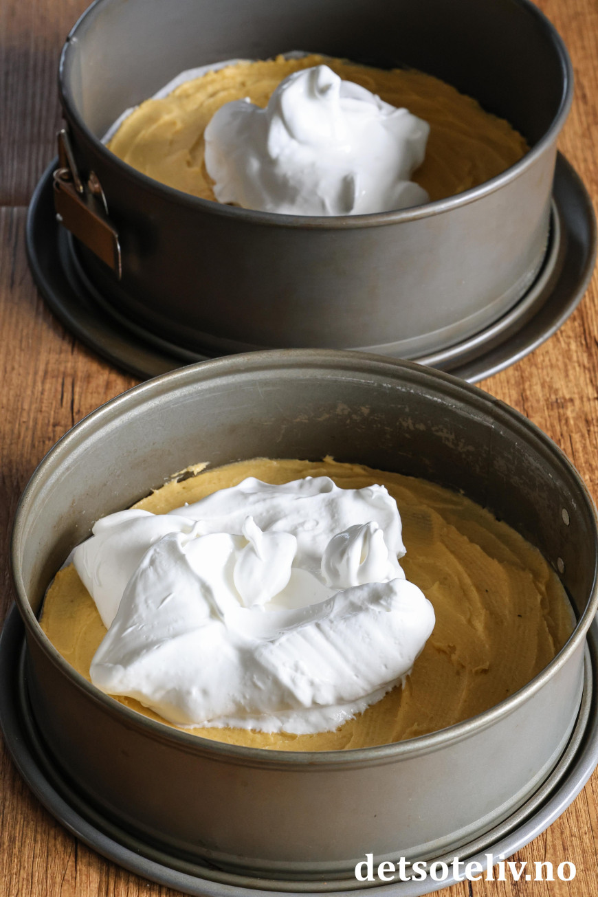 Visp eggehvitene stive. Tilsett sukkeret og pisk videre til stiv marengs. Fordel marengsen jevnt over deigen i de to formene.