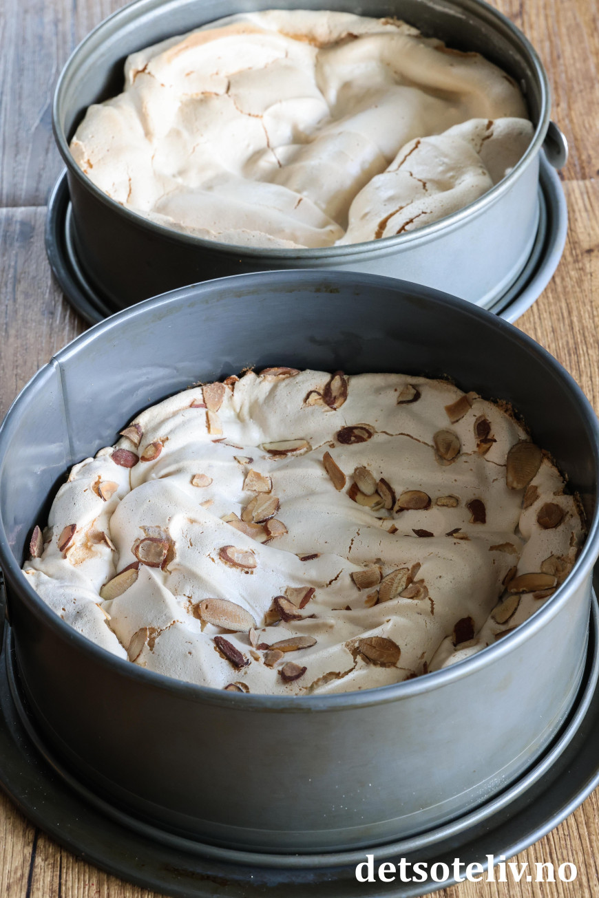 ♥ Hvis du har varmluftsovn, går det fint å steke begge kakebunnene samtidig. Men bytt gjerne plassering på kakebunnene etter halve steketiden, slik at bunnene blir like godt stekt.