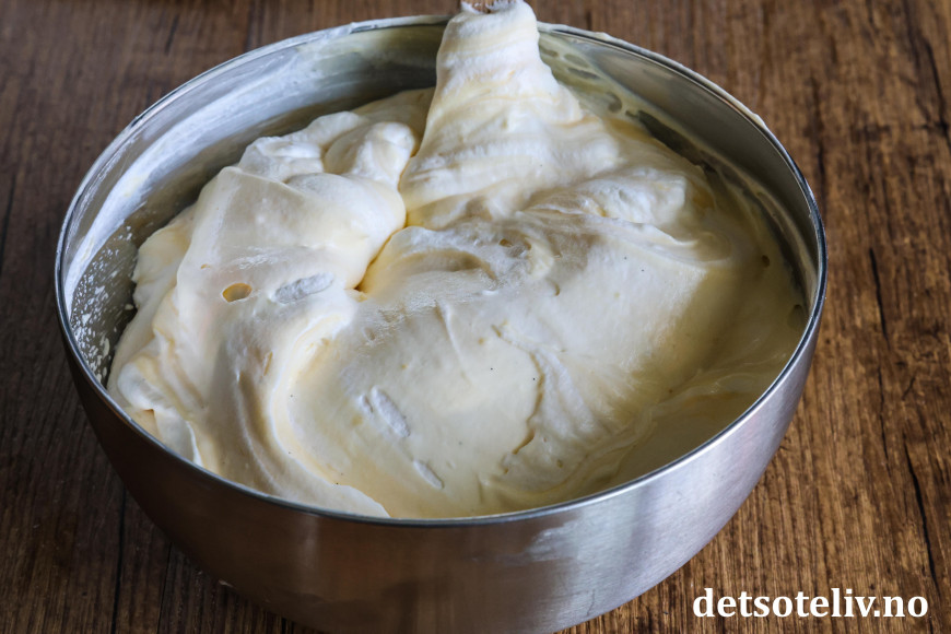 ♥ Når du lager fyllet må du blande kremen og vaniljekremen helt forsiktig. Jeg anbefaler å bruke en slikkepott og bare så vidt røre fyllet sammen. Det gjør ikke noe hvis fyllet er litt marmorert. Det er min erfaring at fyllet blir altfor tyntflytende hvis du rører for mye.