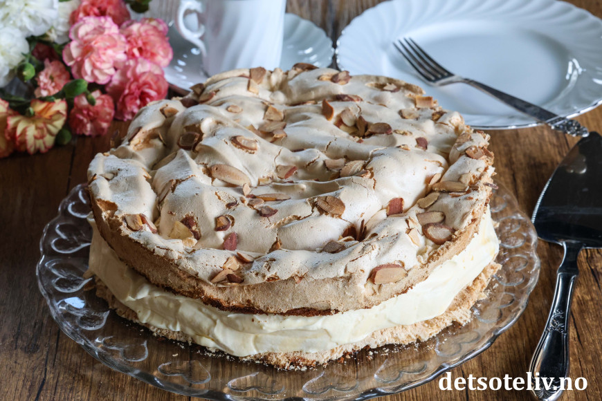 Visp eggehvitene stive. Tilsett sukkeret og pisk videre til stiv marengs. Fordel marengsen jevnt over deigen i de to formene. Strø mandelflak over den ene av bunnene.