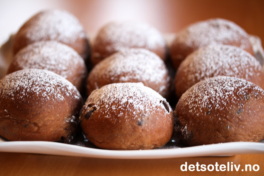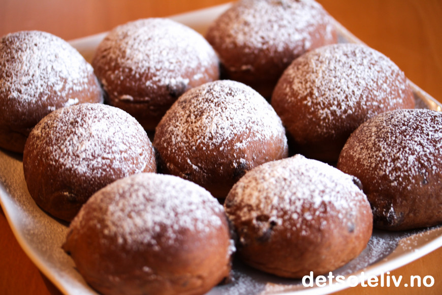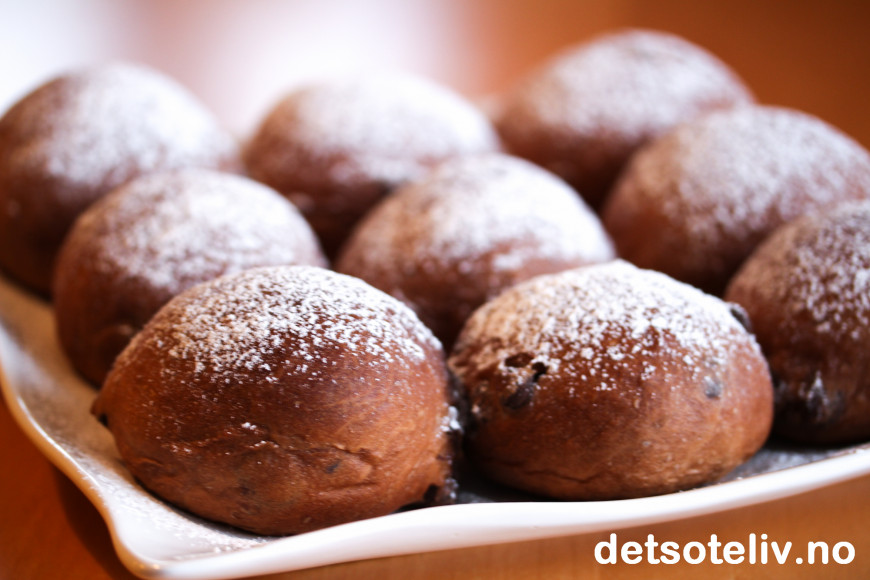 ♥ Merk at disse bollene skal stekes på nokså høy steketemperatur på 230°C. Det er nokså varmt, så følg med så bollene ikke blir for brune utenpå. Siden bollene er så brune av sjokoladen, er det ikke like lett å se når bollene er gylne og gjennonstekte.