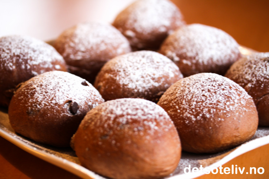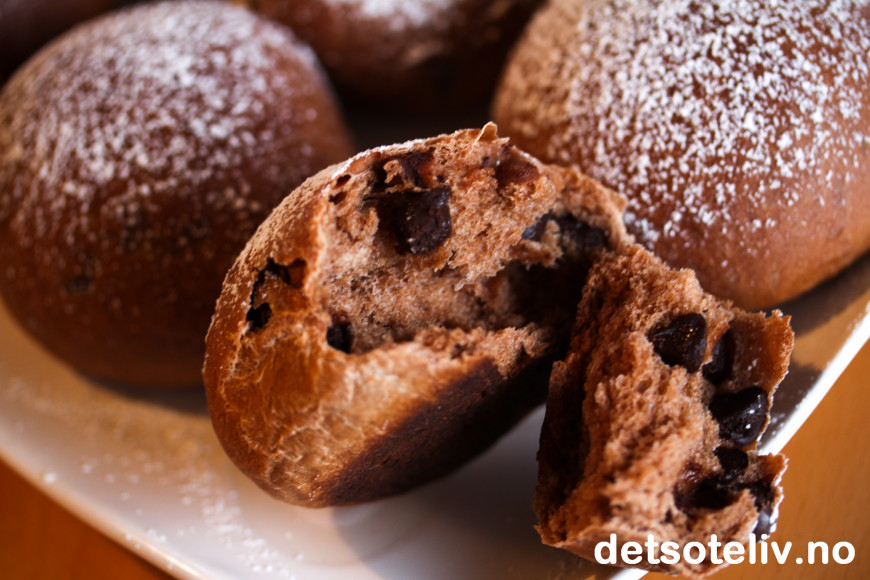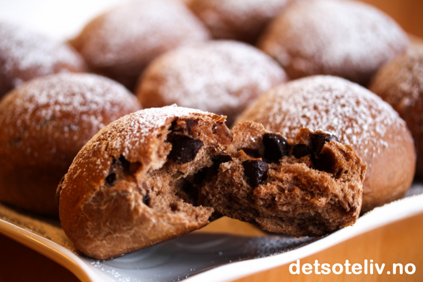 ♥ Se også Sjokoladeboller med sjokoladefyll, som er basert på samme deig, men laget som snurrer med sjokoladefyll i stedet for runde boller med sjokoladebiter.