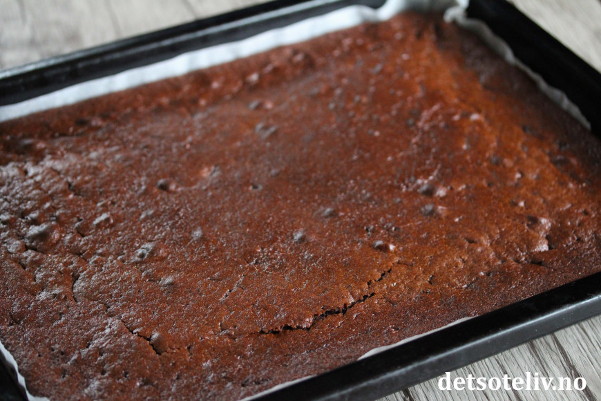 Ha deigen i en stor, bakepapirkledd langpanne (ca. 30 x 40 cm). Stek kaken midt i ovnen ved 200°C i 30 minutter.