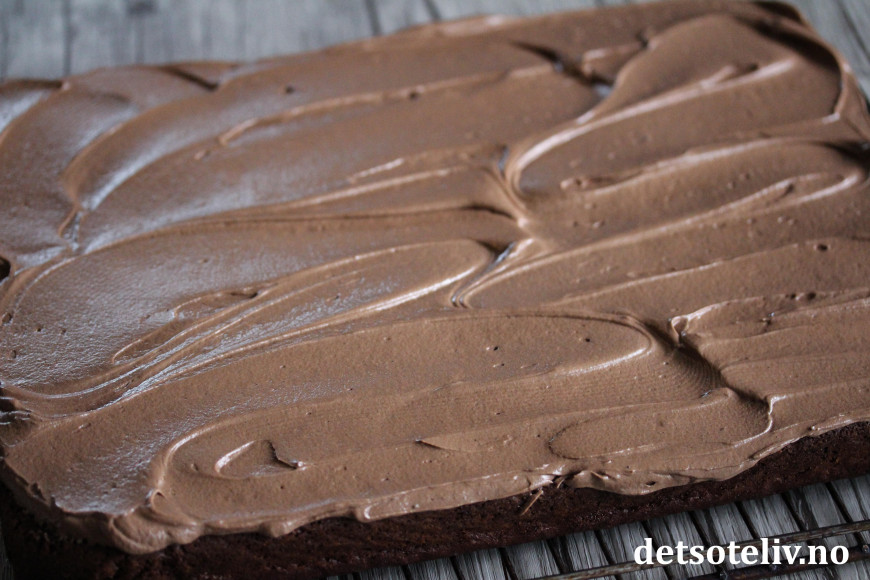 Lagde denne i går. Veldig god i går og minst like god i dag! En hit blant store og små. Oppbevarte den i plast på benken til i dag, og den er myk og god. Kokesjokoladen jeg brukte var 100 gr lys variant og 100 gr mørk, og brukte melange i glasuren. Jeg trodde det skulle bli altfor mye glasur, men jeg smurte på alt og er glad for det. Syns kaka blir veldig god med all glasuren på (og jeg er i utgangspunktet ikke veldig glad i et for tykt lag med smørkrem), mens min samboer syns det var litt i meste laget. Jeg bakte til barneselskap og hadde derfor ikke i kaffe. Hadde ikke helmelk, så blandet kremfløte og ekstra lettmelk. Frøs ned halvparten av kaka med glasur på, i biter på et stort skjæreunderlag, men har ikke smakt hvordan den holder seg i smak og konsistens enda. Denne kaka skal jeg definitivt lage igjen!