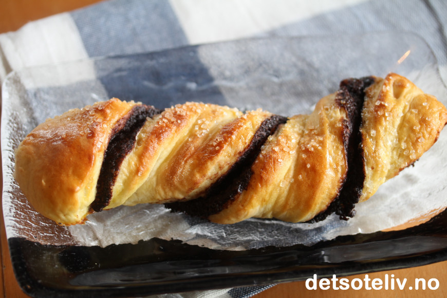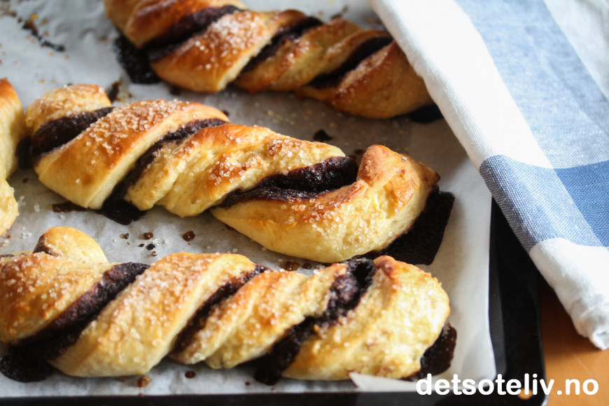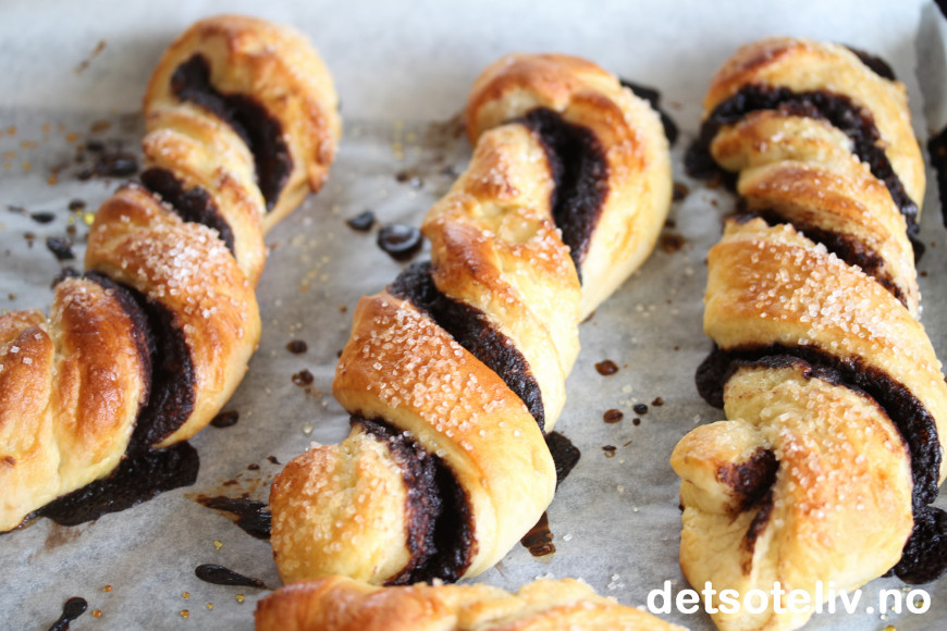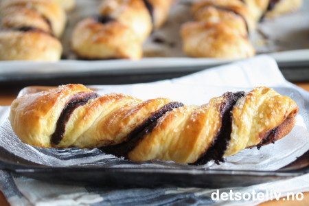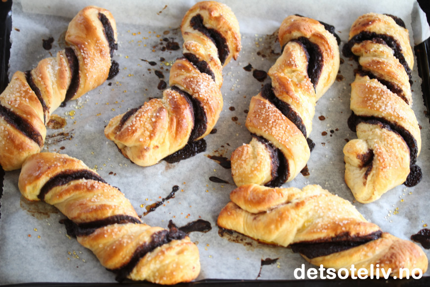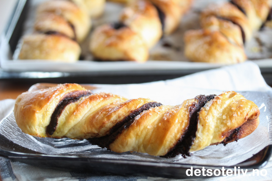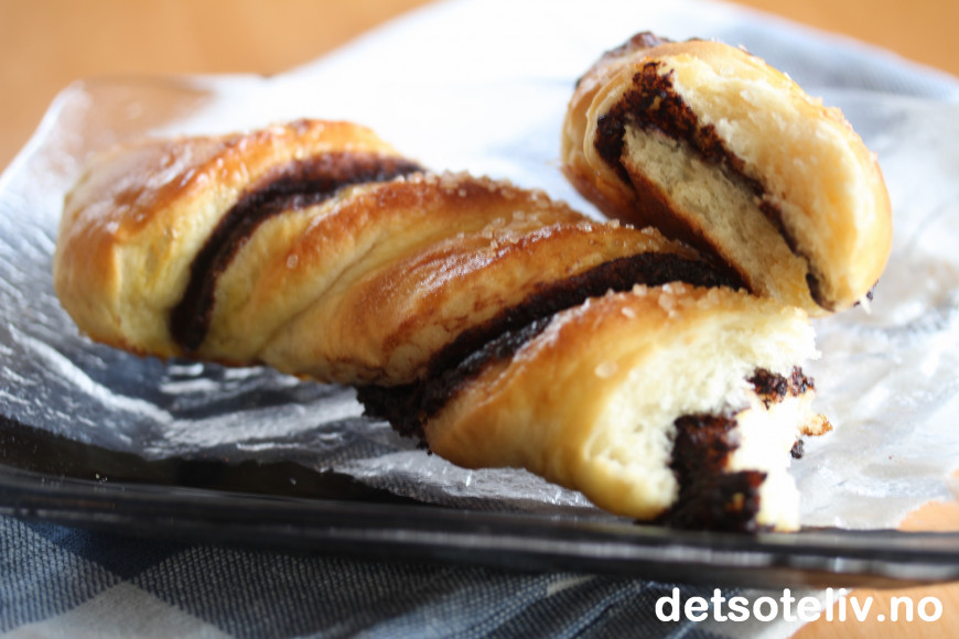 Se også oppskrift på Verdens beste kanelruller (Cinnamon Sugar Twists), som er basert på samme oppskrift, men der bollene er fylt med kanelfyll i stedet for sjokoladefyll.
