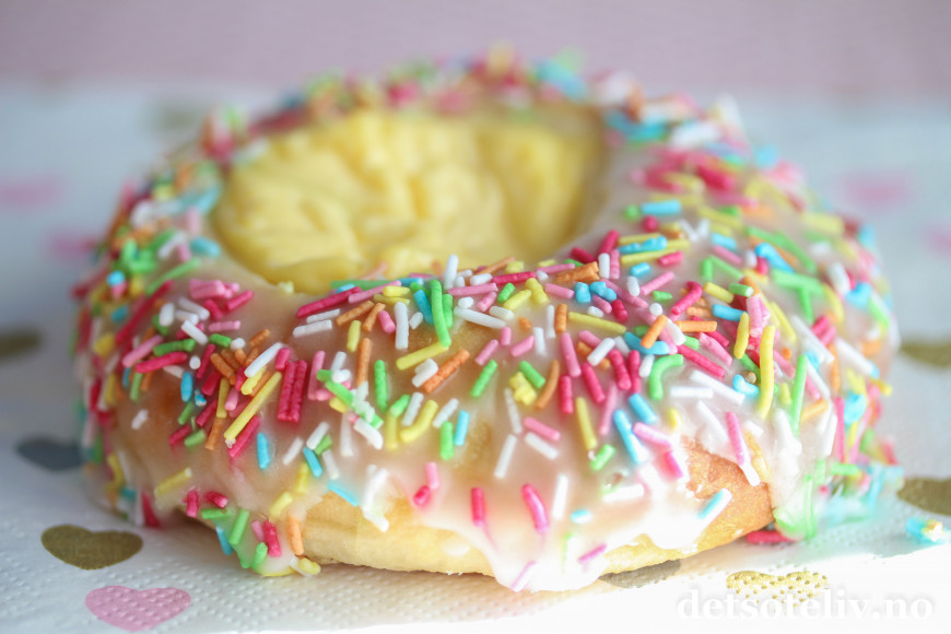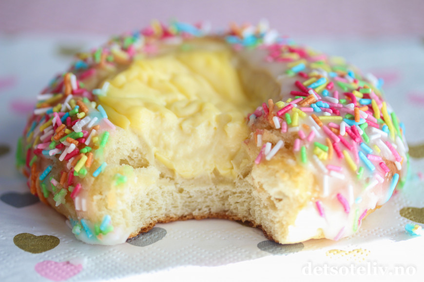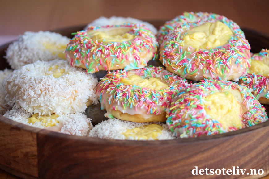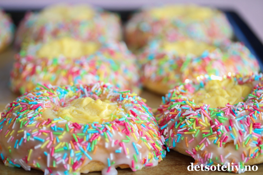 Trill ut bollene med en gang (ca 30 stk) og legg dem på bakepapirdekkede stekeplater med god avstand imellom. Trykk bollene helt flate med hendene. La dem deretter heve lunt i 1 time. Når bollene er ferdighevet, trykk en stor fordypning i midten av hver bolle med fingrene og legg en stor ss vaniljekrem i fordypningen.