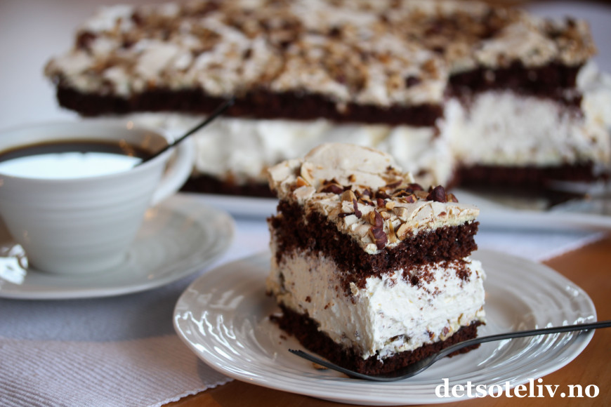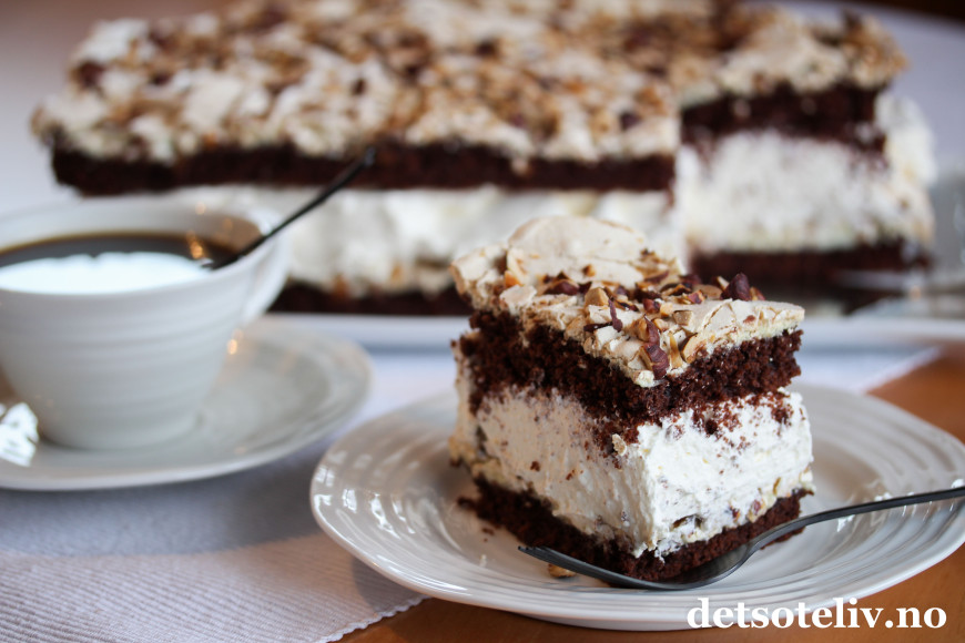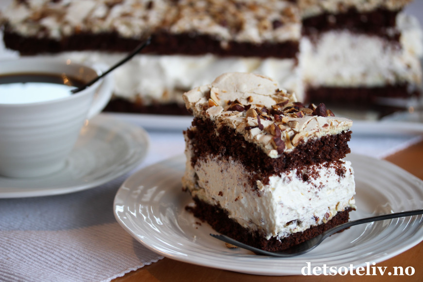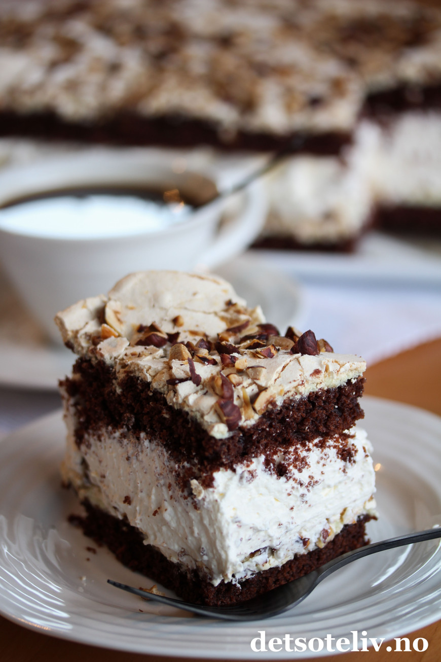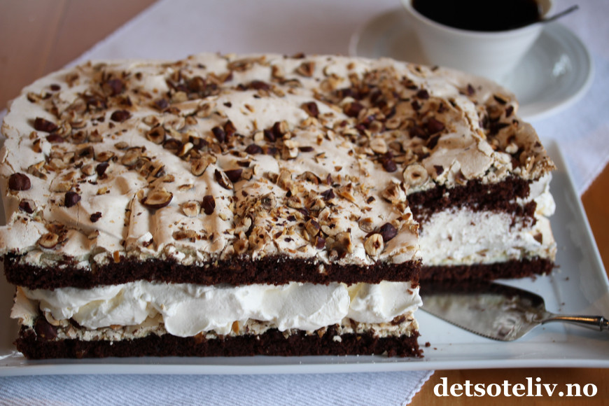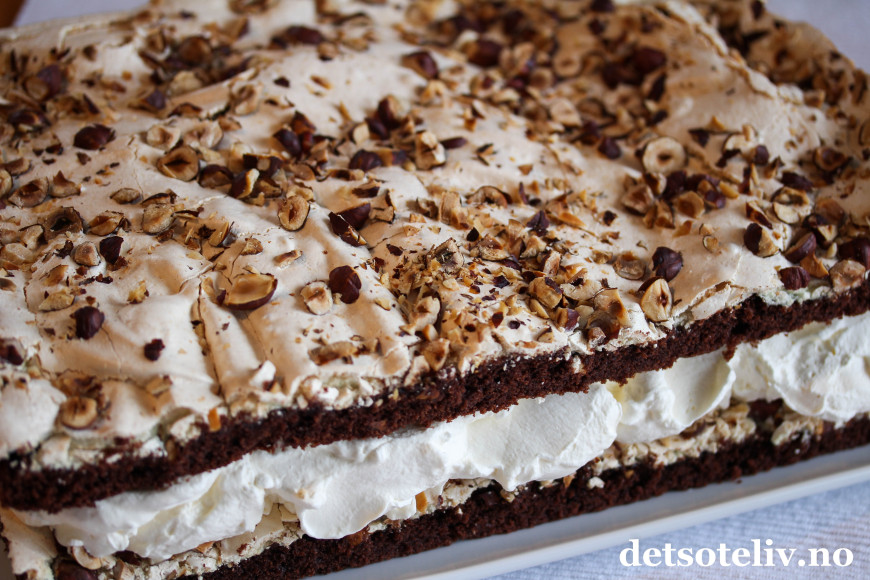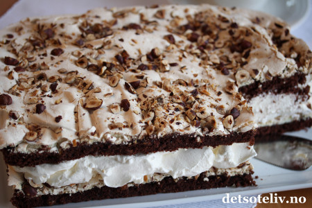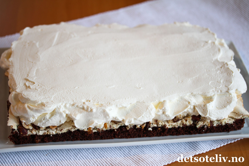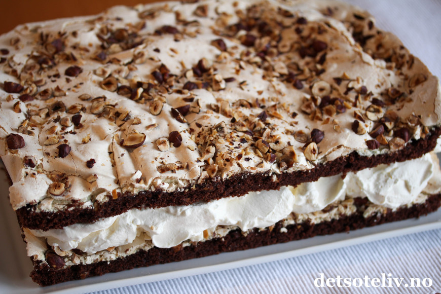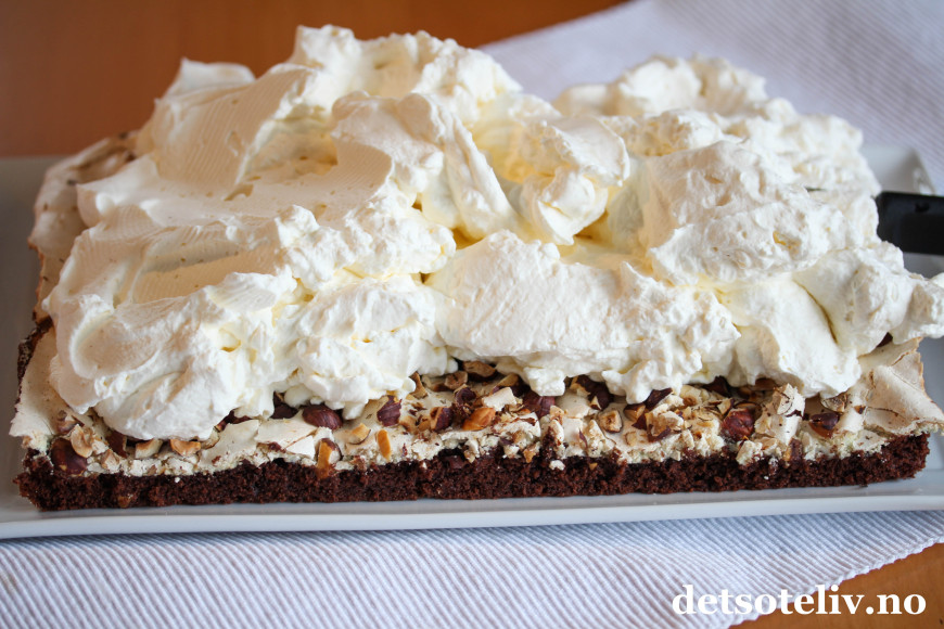 I stedet for den tradisjonelle, lyse kakebunnen er det her myk sjokoladekake som dekkes med marengs og hakkede hasselnøtter. Kaken fylles med masse søt, luftig, pisket krem.