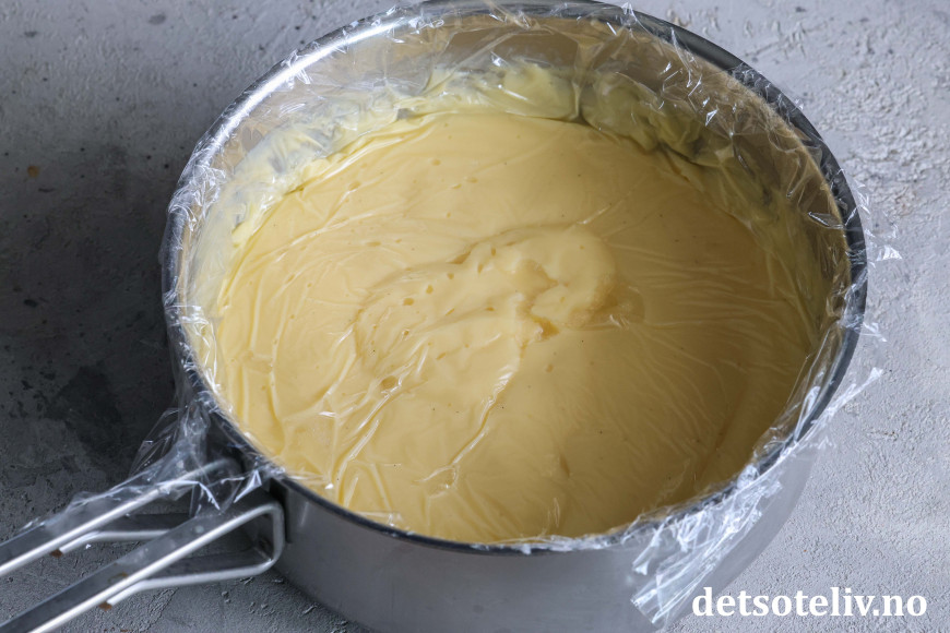 Sett så vaniljekremen i kjøleskapet til den er helt tykk (gjerne over natten, men dekk da gjerne over med litt plastfilm så det ikke danner seg snerk på overflaten).