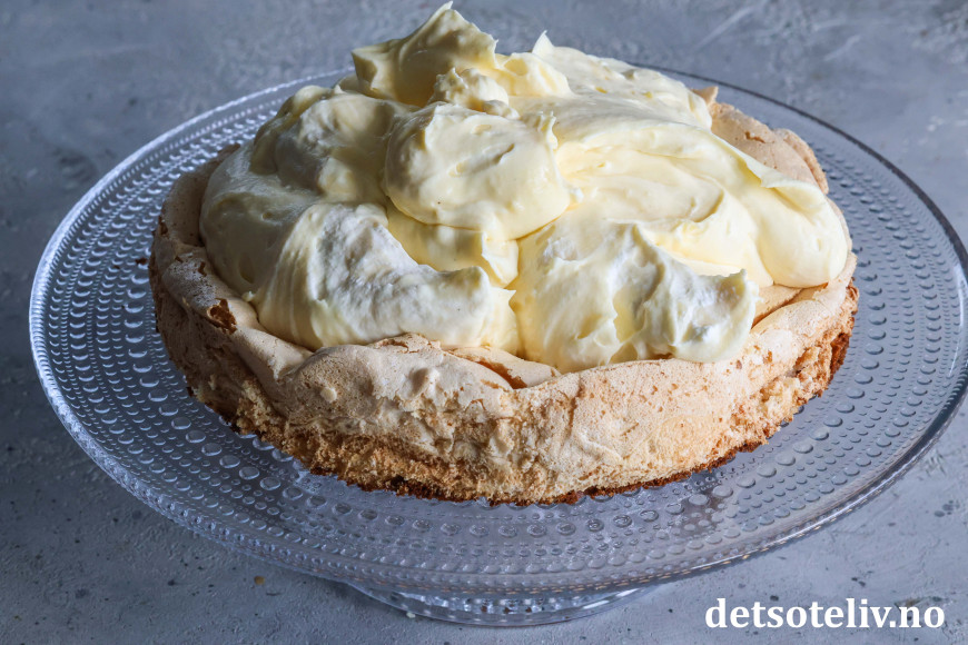 Legg den ene kakebunnen (uten mandelflak) på et passende fat (jeg foretrekker at marengsen vender oppover). Fordel over vaniljekremen over kakebunnen i et tykt lag.