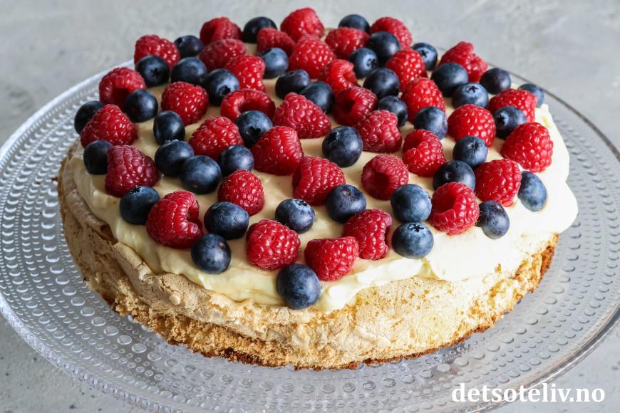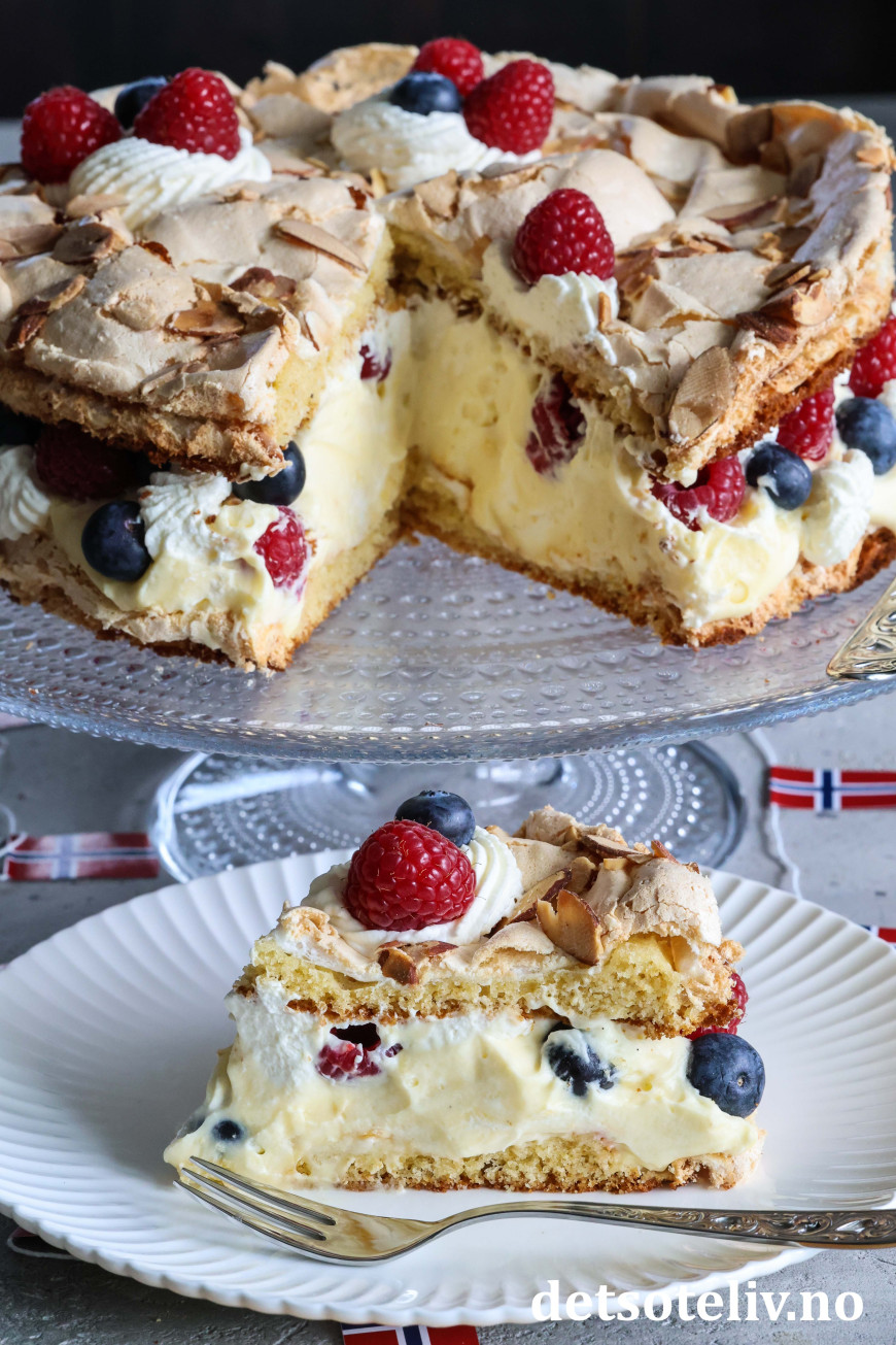 Verdens Beste som rund kake, fylt med masse hjemmelaget vaniljekrem, fløtekrem og friske bær.