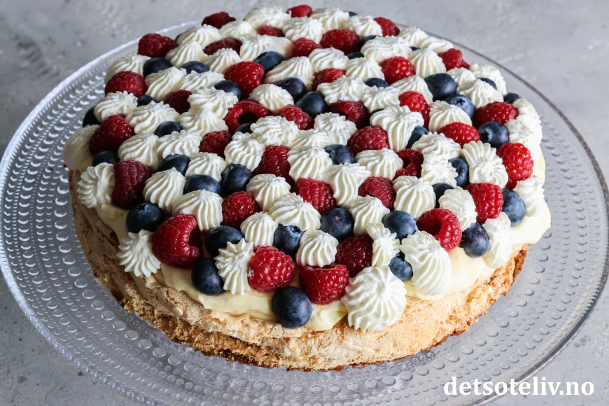 Legg forsiktig på den andre kakebunnen. Pynt eventuelt med litt krem og bær på toppen av kaken. La kaken stå kjølig frem til servering.