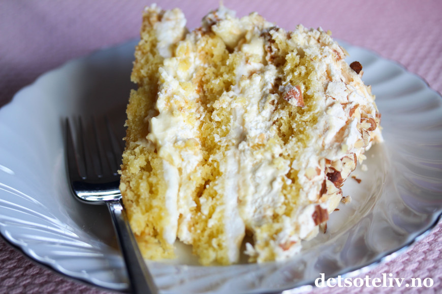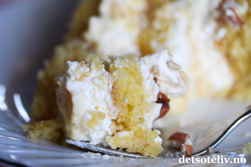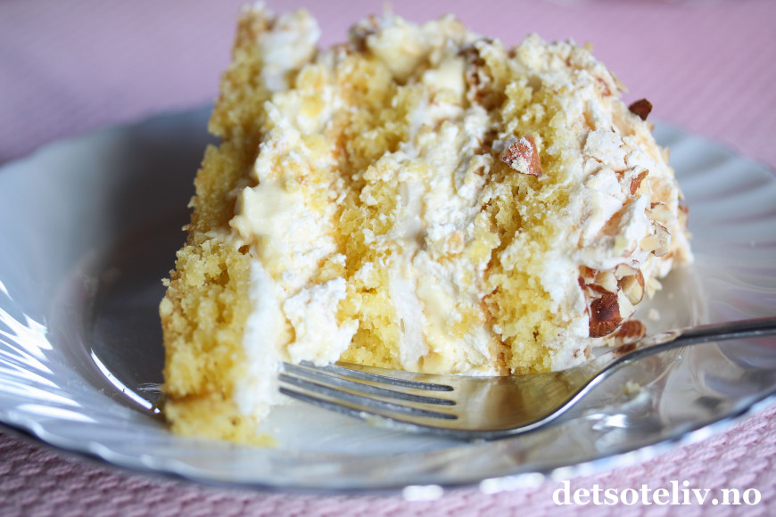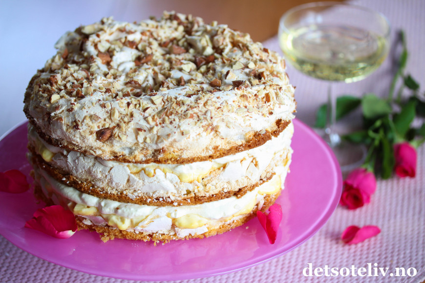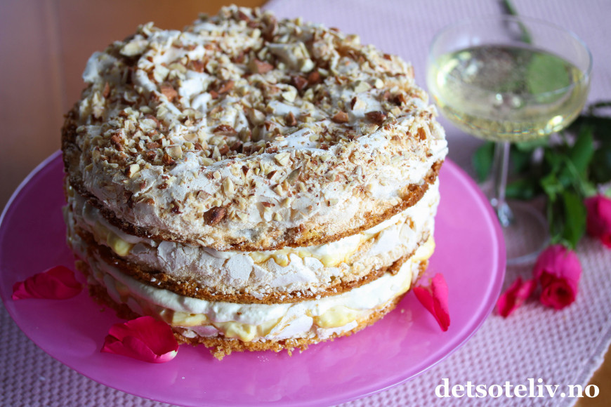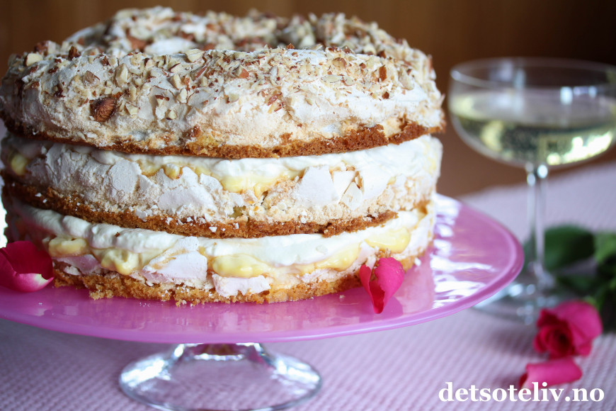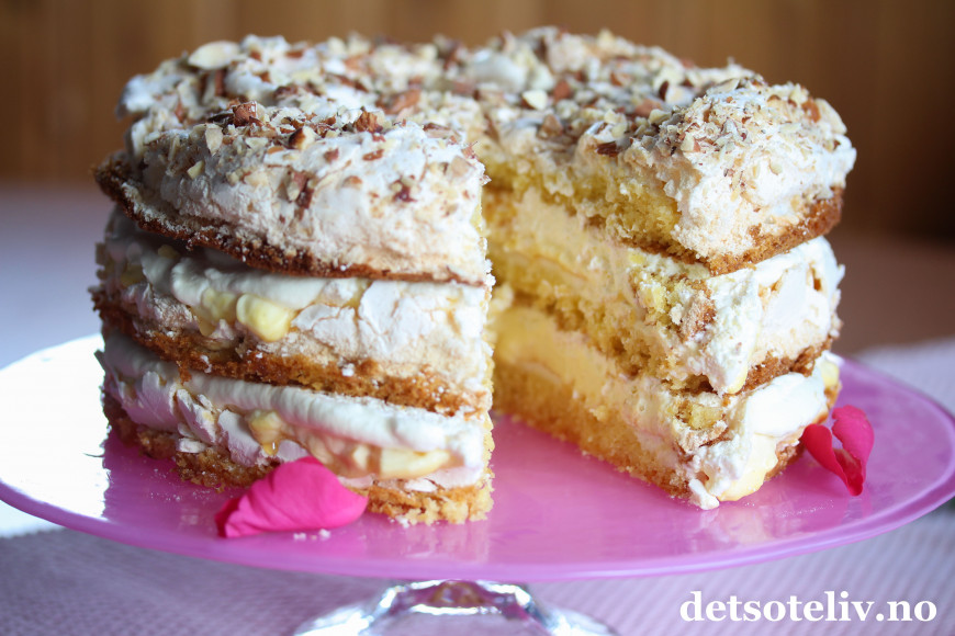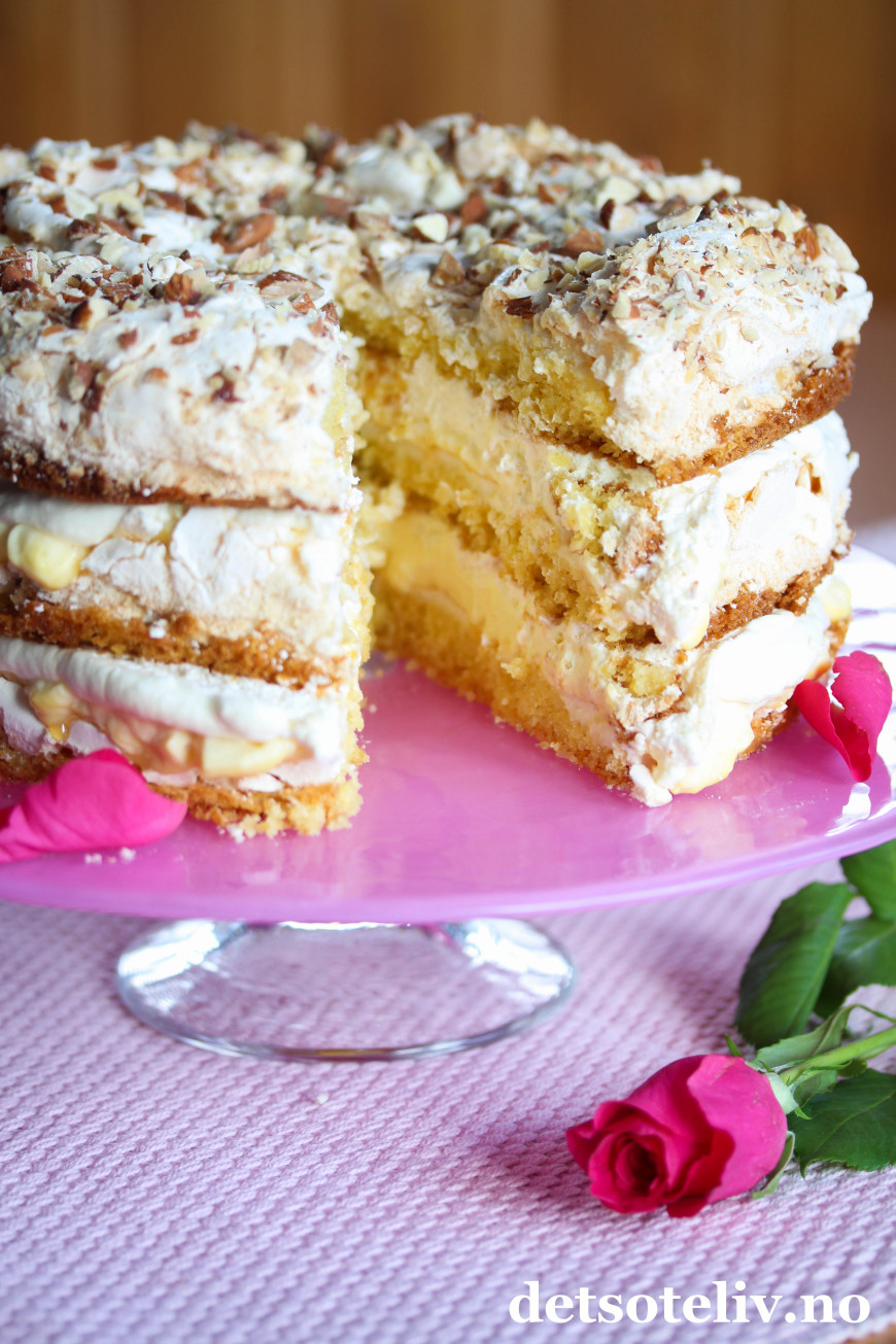 Denne kaken kombinerer med andre ord de kjente gode smakene av vaniljekake, marengs, mandler og vaniljekrem med et flott, nytt design. Dette er en kake som gjestene kommer til å elske!