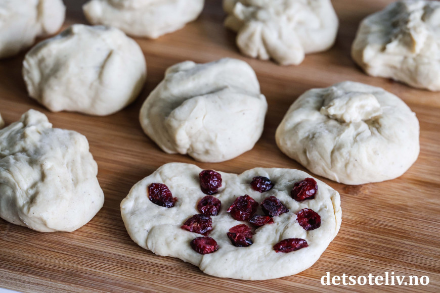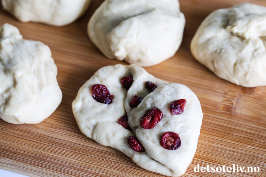 Klem hver bit flat og trykk på godt med tørkede tranebær. Brett deigen halveis over og klem på noen tranebær til før du triller deigen til en rund bolle. På denne måten får du tranebær jevnt fordelt i bollene.