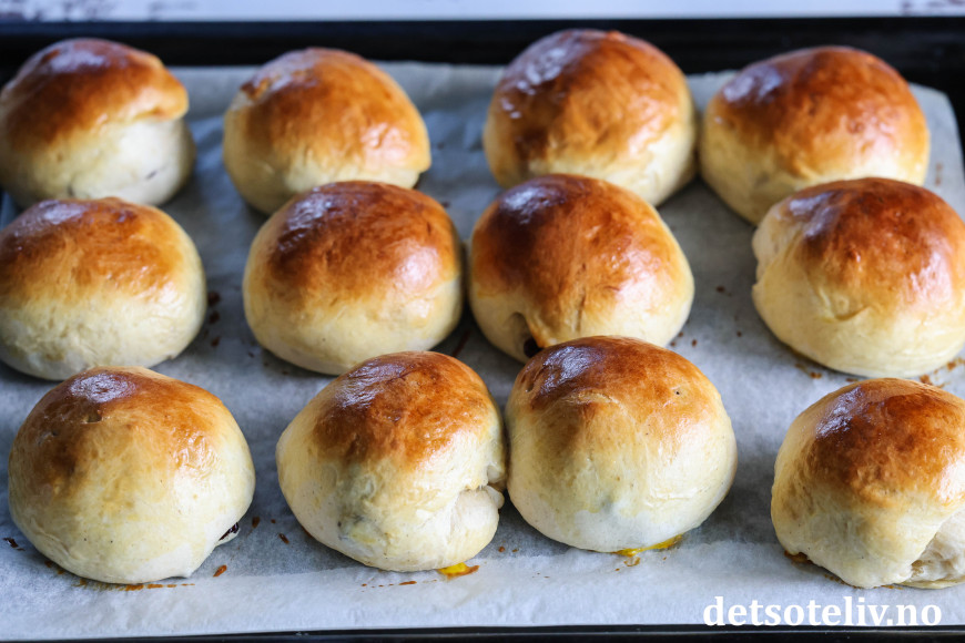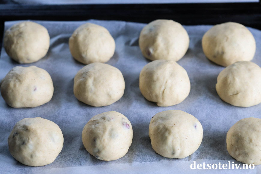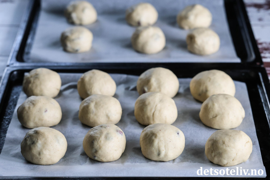 Sett bollene på bakepapirdekkede stekeplater. La dem heve lunt i 1 time.