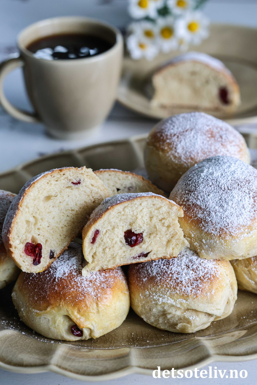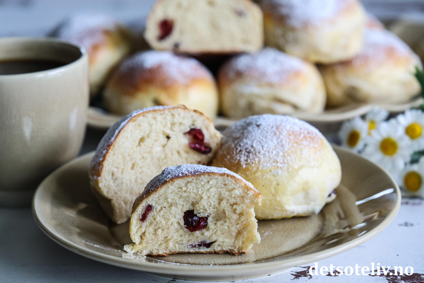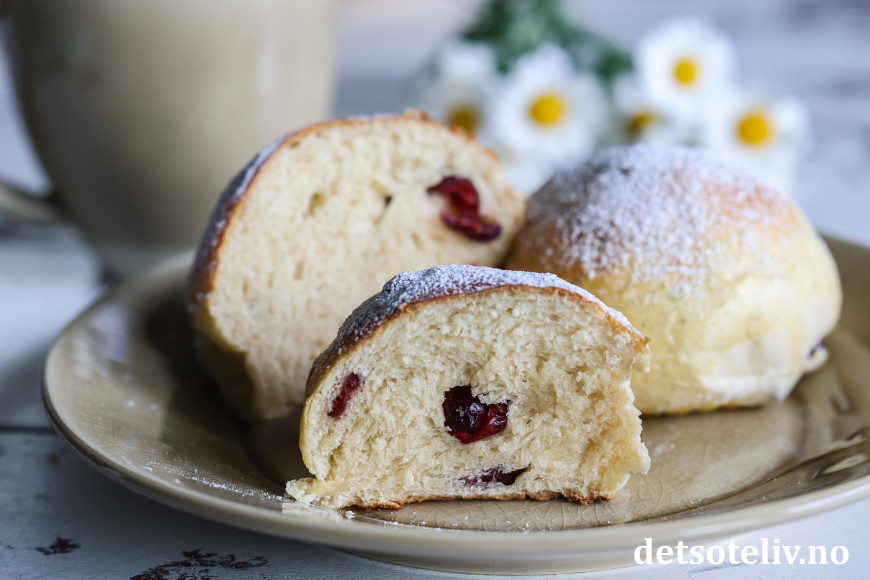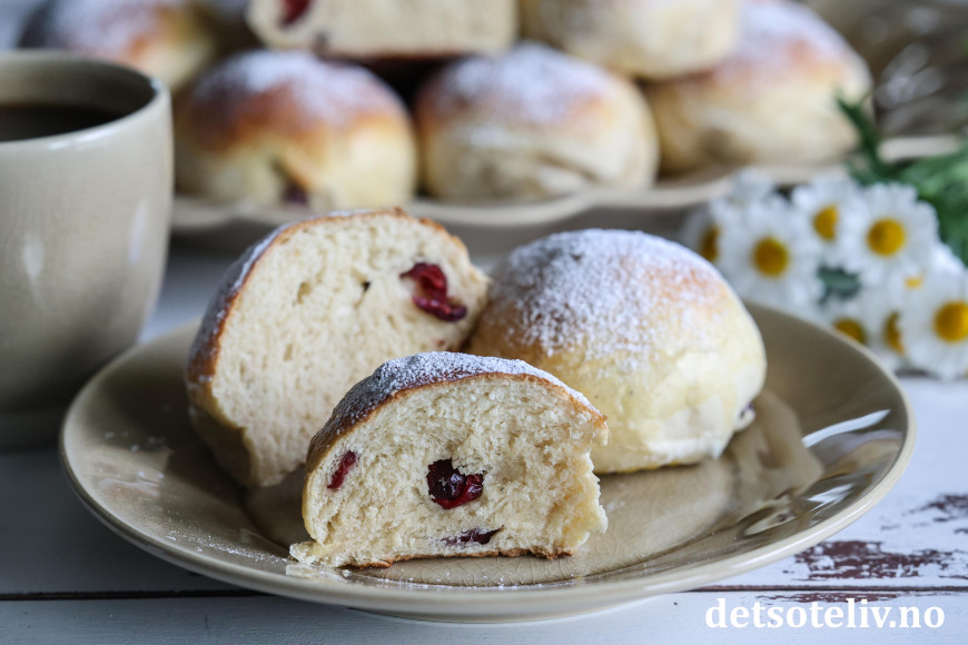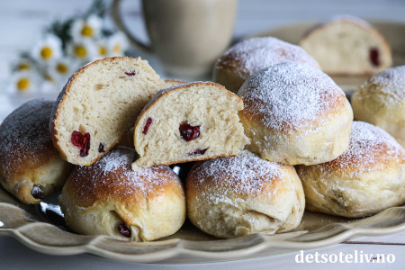 Tranebær er litt mindre søte enn rosiner, og det gjør at disse myke bollene blir sommerlige og veldig gode. De litt syrlige tranebærene gjør at det blir ekstra godt med melisdryss oppå bollene.