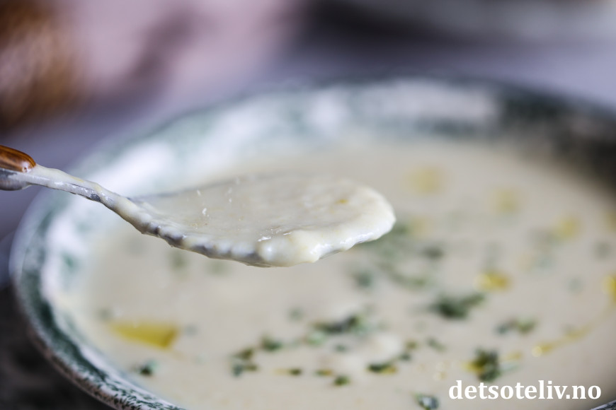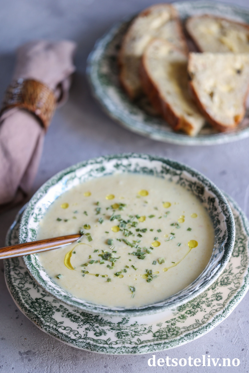 Ved servering kan du drysse litt gressløk over suppen. Noen dråper med god olivenolje blir også lekkert!