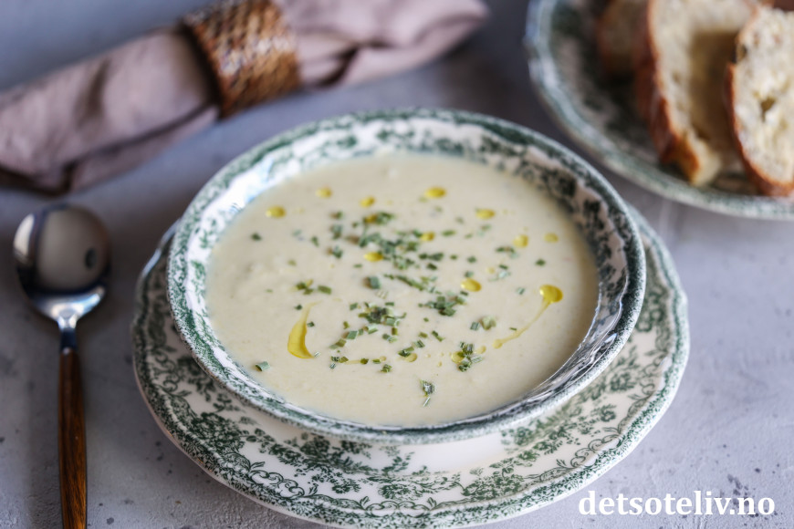 Vichyssoise er en kremete og fyldig, fransk potet- og purreløkssuppe som skal serveres kald.
