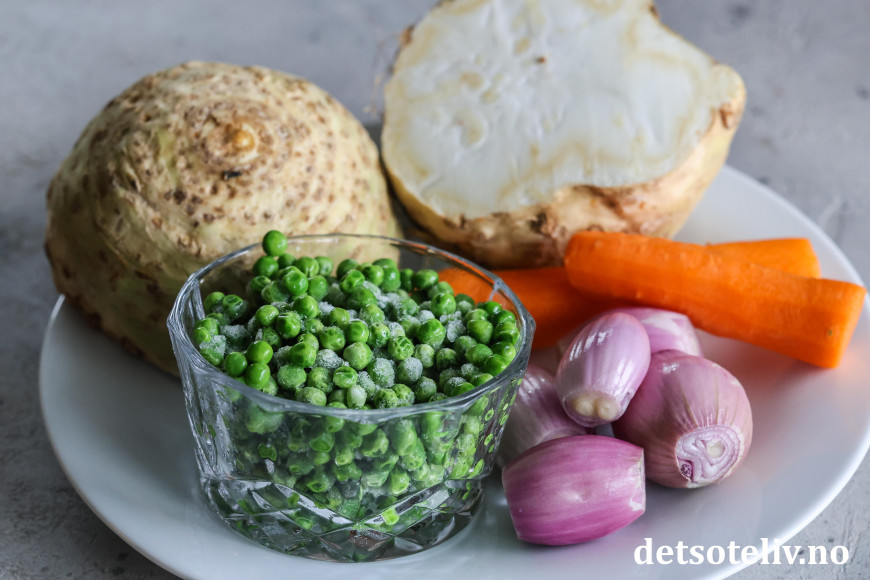 Skrell sjalottløk og skjær i store biter. Skrell sellerirot og gulrøtter og skjær i terninger. Ha dette i gryten sammen med ertene.