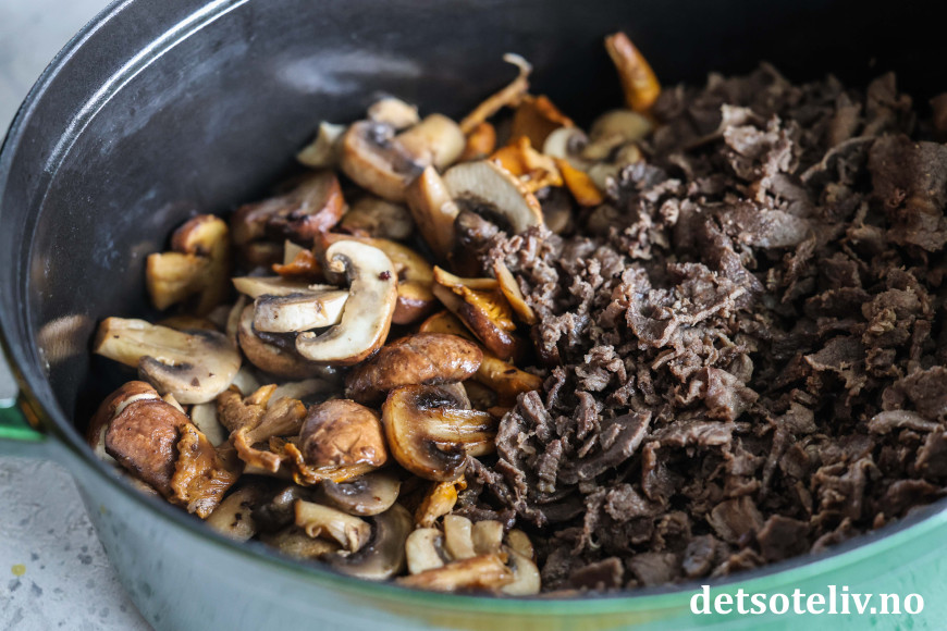 Smelt smør i den samme pannen som du har stekt kjøttet i. Skjær sopp i litt tykke skiver (kantareller kan du rive opp med hendene) og ha i pannen. Stek soppen til den får god farge og klapper sammen i volum. Ha den stekte soppen i gryten. Kok ut pannen med litt vann og ha stekesjyen i gryten.