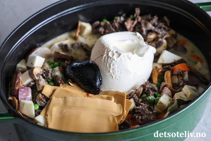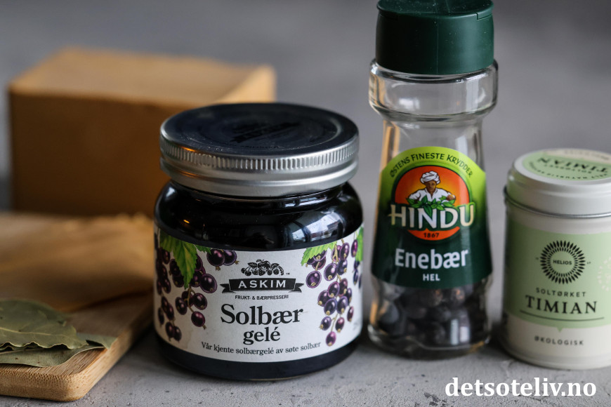 Ha også crème fraîche, brunost og solbærgelé i gryten.