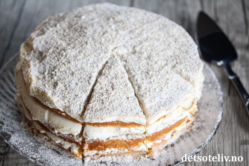♥ Som sagt er det helt naturlig at det vil drysse av mandel-/og melisfyllet når du skjærer i kaken, og det er nettopp det som karakteriserer denne kaken.