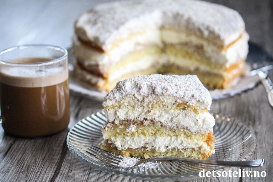 Bløtkaker fylles jo gjerne med bær, men siden dette ikke er like tilgjengelig på vinteren (i hvert fall var det ikke det før i tiden), er fyllet i denne kaken et friskt og spennende alternativ.