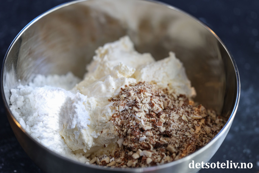 Hakk mandlene fint. Dette gjøres raskt i food processor.