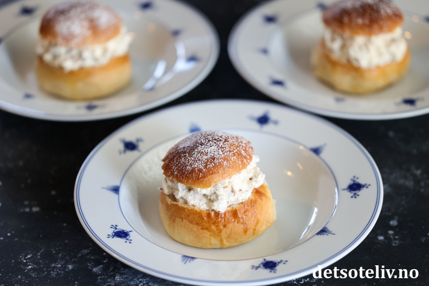 ♥ Du kan bruke ferdigkjøpte hveteboller, men selvfølgelig helst hjemmelagde. Du finner mange bolleoppskrifter her på Det søte liv. Oppskriften i dette innlegget er halv porsjon av Verdens beste boller. Du får jo da mer enn 5 boller. De du ikke fyller med krem, kan gjerne fryses.