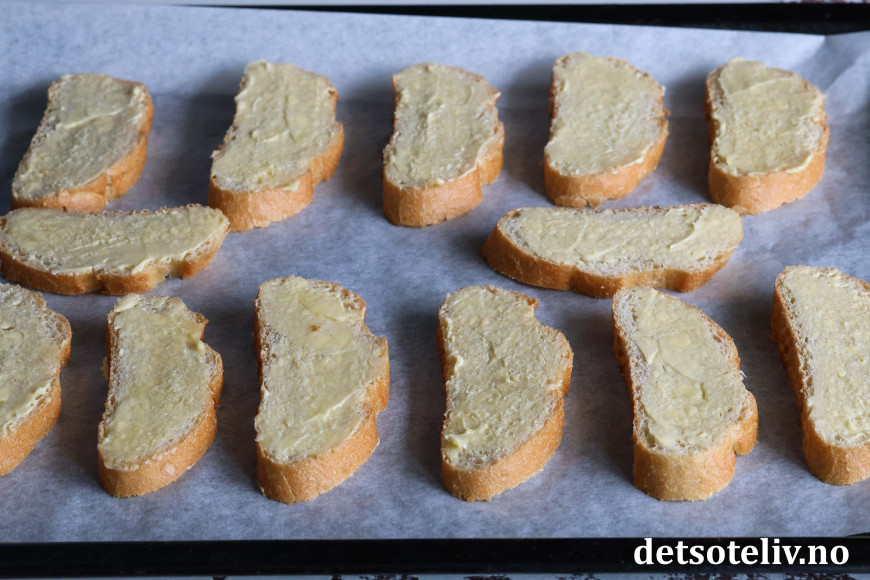 Skjær baguette i skiver. Smør skivene med smør på begge sider, og legg dem på en bakepapirdekket stekeplate.