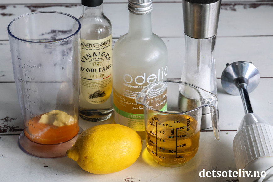 Start med å lage majonesen: Ha eggeplomme, dijonsennep, sitronsaft og hvitvinseddik i en høy, smal beholder som passer til stavmikseren.
