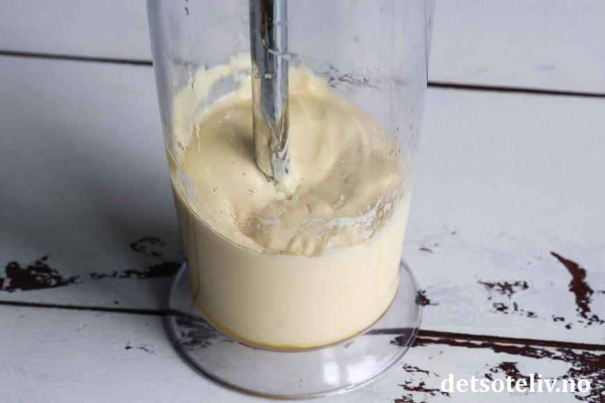 Kjør blandingen sammen med stavmikseren mens du gradvis og sakte sper med oljen. Du vil etter hvert se det danner seg en tykk majones.