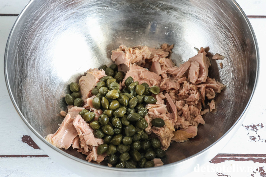 La tunfisk i olje renne av seg i en sil. Ha tunfisken i en bolle og tilsett kapers. Kjør dette sammen til en mos med stavmikseren. Tilsett noen basilikumblader og kjør dette også inn i tunfiskmosen. Vend inn majonesen. Smak til med dijonsennep, sitronsaft og salt.