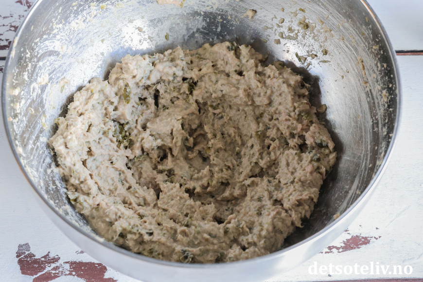 Tilsett noen basilikumblader og kjør dette også inn i tunfiskmosen.
