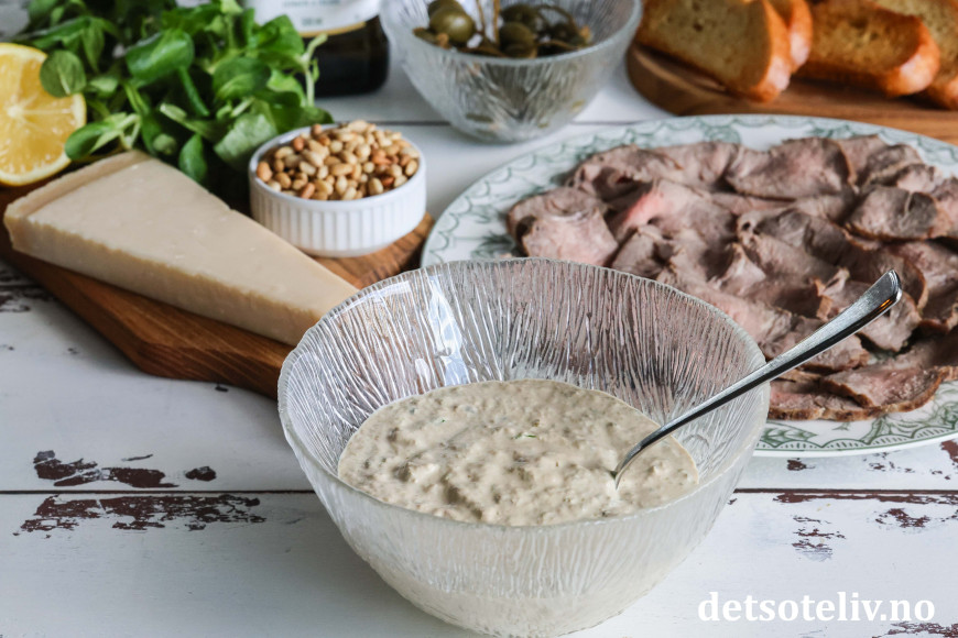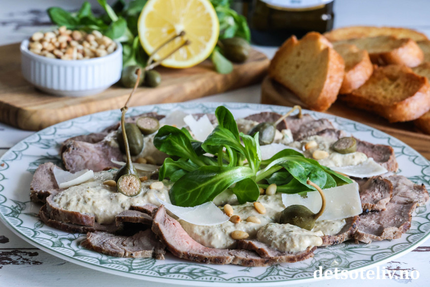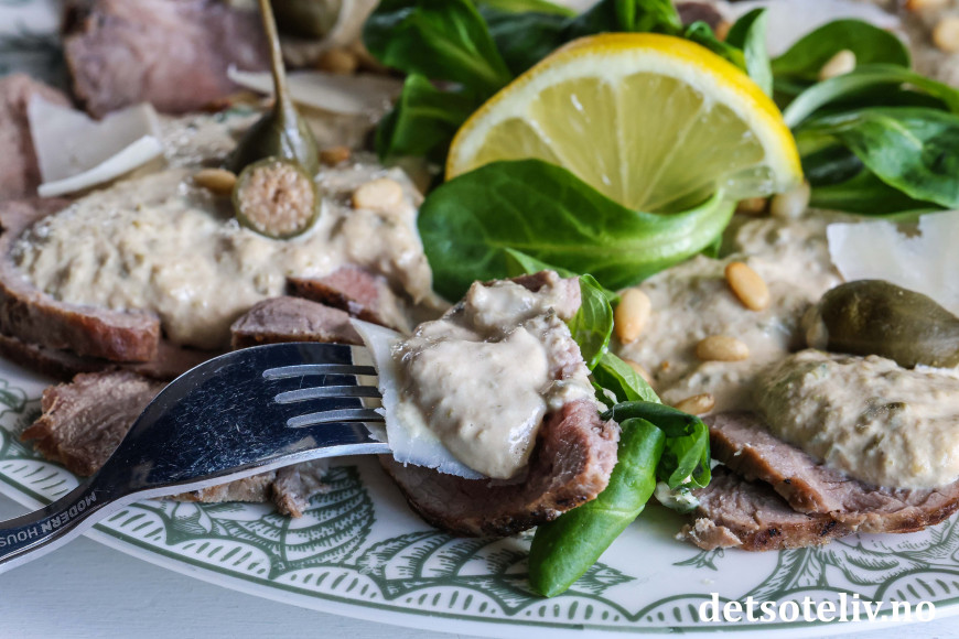Her kombineres kalvefilet ("vitello" på italiensk) med deilig majones som moses sammen med tunfisk ("ton" på italiensk) og kapers.