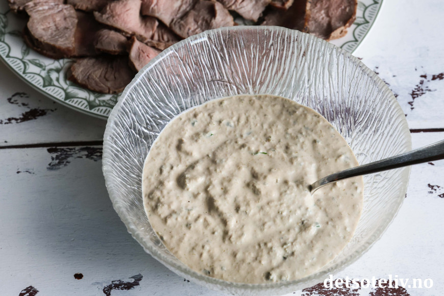 Vend inn majonesen. Smak til med dijonsennep, sitronsaft og salt.