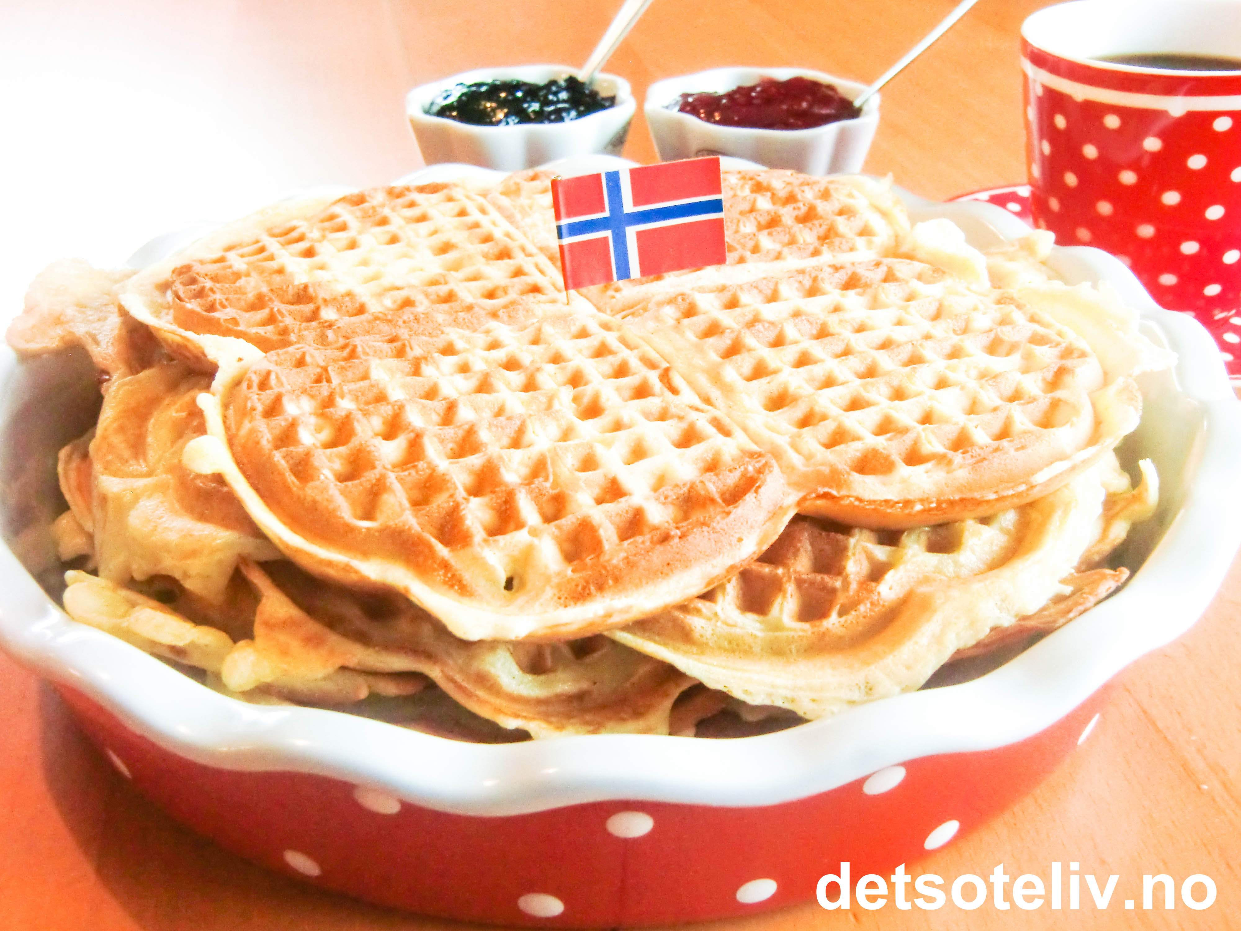 Ja, nå er det VM-stemning i alle norske hjem, og visst er det fantastisk morsomt med gull! Til og med jeg fikk med meg dagens spennende innspurt. Det er fare for at VM-entusiasmen hjemme hos meg vil akselerere mot kommende helg, for da tar svigerforeldrene mine turen over fjellet for å overvære festivitasen i Kollen, og det er nokså sikkert at svigerfar vil tilbringe mesteparten av tiden sin der:-) I anledning VM-besøket bakes det VM-kake, VM-boller, VM-cupcakes og selvfølgelig "Gullcupcakes" på mitt kjøkken.... Puh, det er slitsomt med all denne idretten;-) Men her har dere først dagens supergode VM-vafler - og det må være lov å kose seg på en seiersdag som denne!