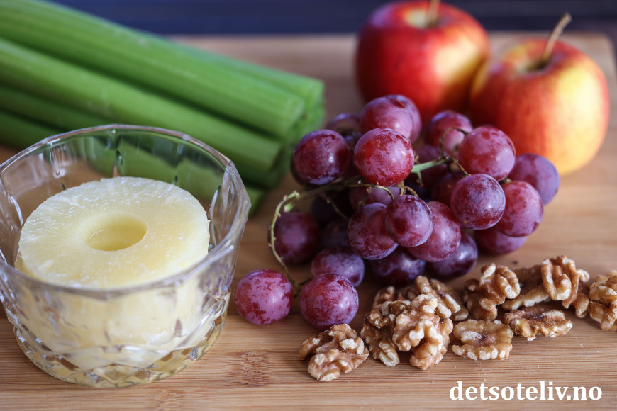 Skrell og rens eplene og skjær dem i små biter. Vask stangselleri godt og kutt dem opp i små terninger. La ananasen renne godt av seg og skjær i mindre biter. Skjær druene i to eller fire, avhengig av hvor store de er. Brekk valnøttene i mindre biter. Ha alt dette i en bolle.