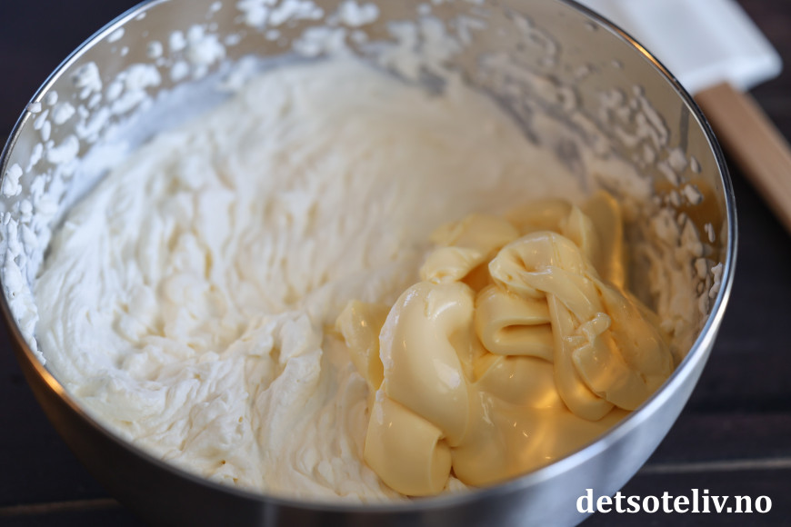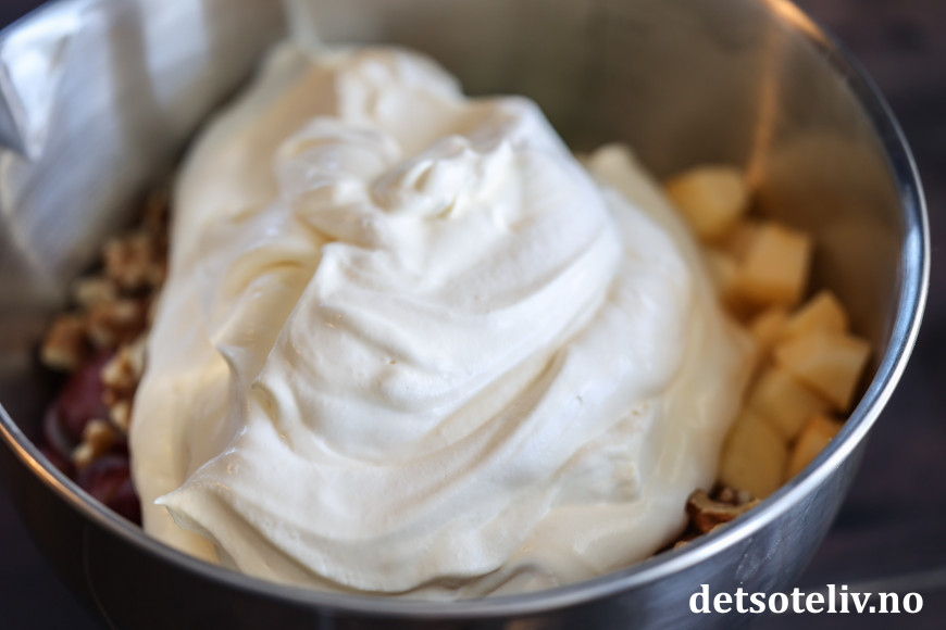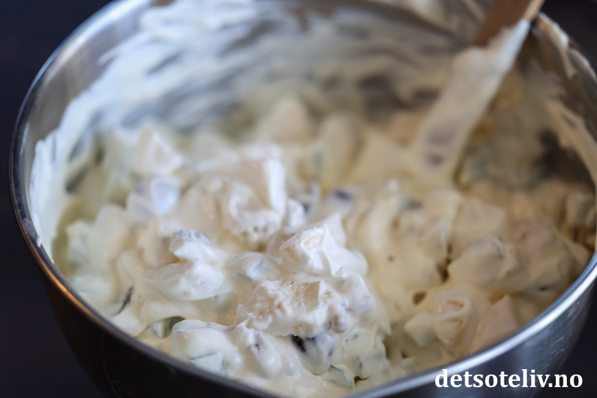 Ha majoneskremen i bollen med fruktbitene. Vend det hele forsiktig sammen.