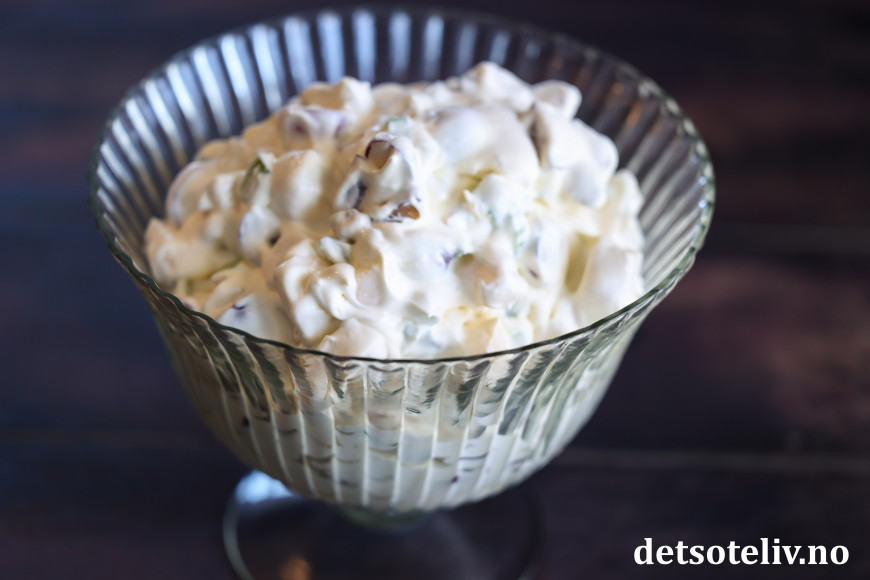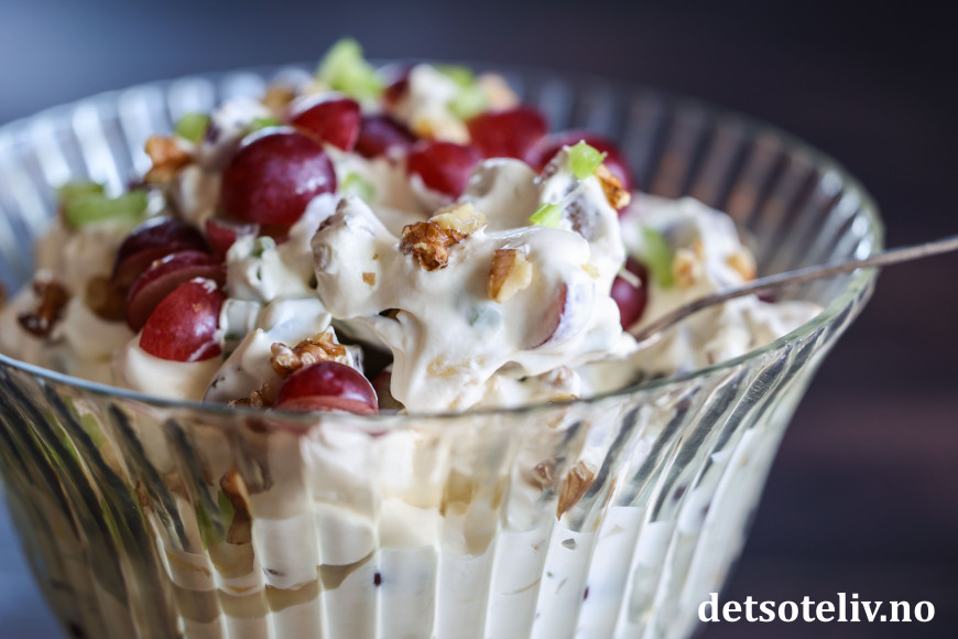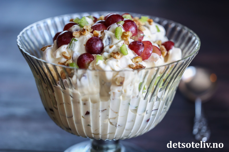 Ha den kremete fruktsalaten i en serveringsbolle. Pynt med druer, valnøtter og eventuelt noen små biter stangselleri.