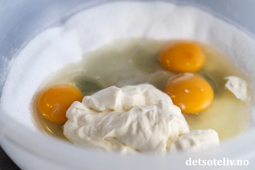 Visp egg og seterrømme lett sammen i en stor bakebolle.