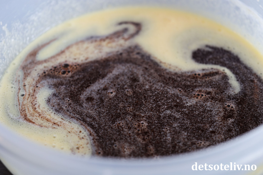 Visp egg og seterrømme lett sammen i en stor bakebolle. Tilsett sjokoladeblandingen. Sikt sammen hvetemel og natron og bland dette inn i deigen. Rør godt slik at deigen blir klumpfri, men ikke lenger enn nødvendig.