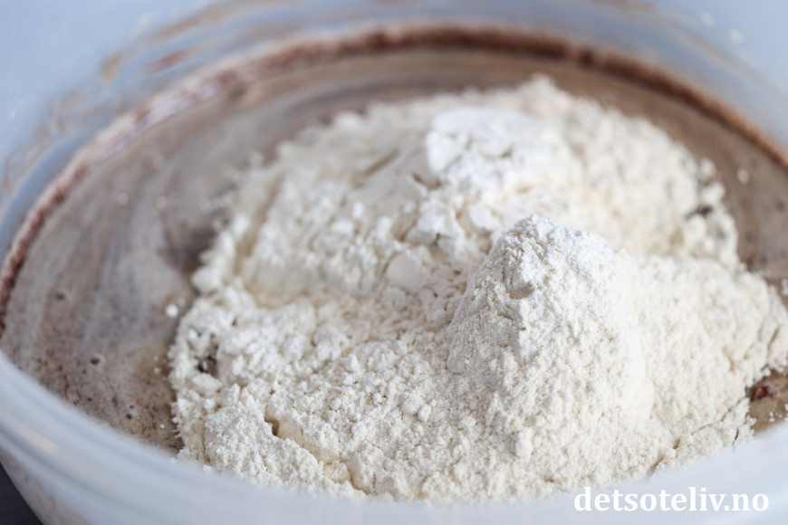 Sikt sammen hvetemel og natron og bland dette inn i deigen.
