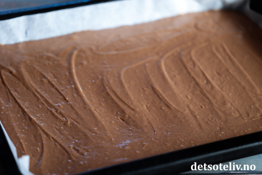 Ha den ene halvparten av deigen i en stor, bakepapirkledd langpanne (ca. 30 x 40 cm). Smør deigen jevnt utover i et tynt lag.
