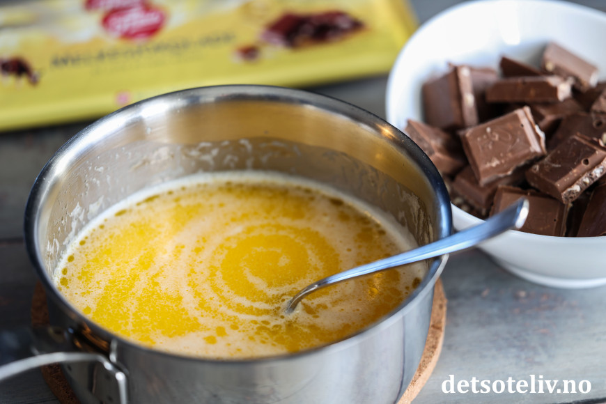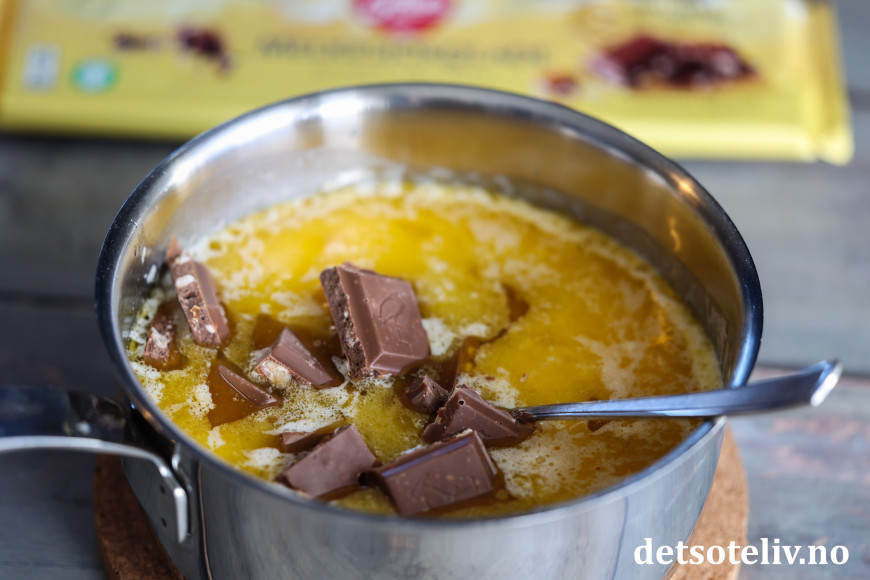 La sjokoladen ligge i kjelen og rør forsiktig rundt til sjokoladen har smeltet helt.