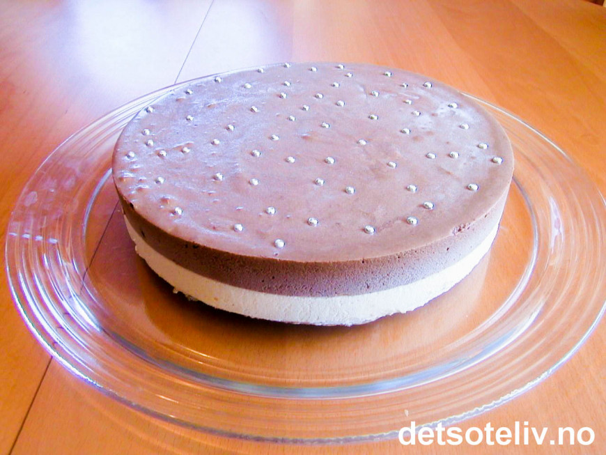 Smelt kokesjokoladen i mikro eller over vannbad. Rør inn i den andre halvdelen av isblandingen. Ha sjokoladeisblandingen over den frosne, lyse isen i kakeformen. Strø over noen sølvkuler til pynt. Sett iskaken tilbake i fryseren til isen har stivnet.