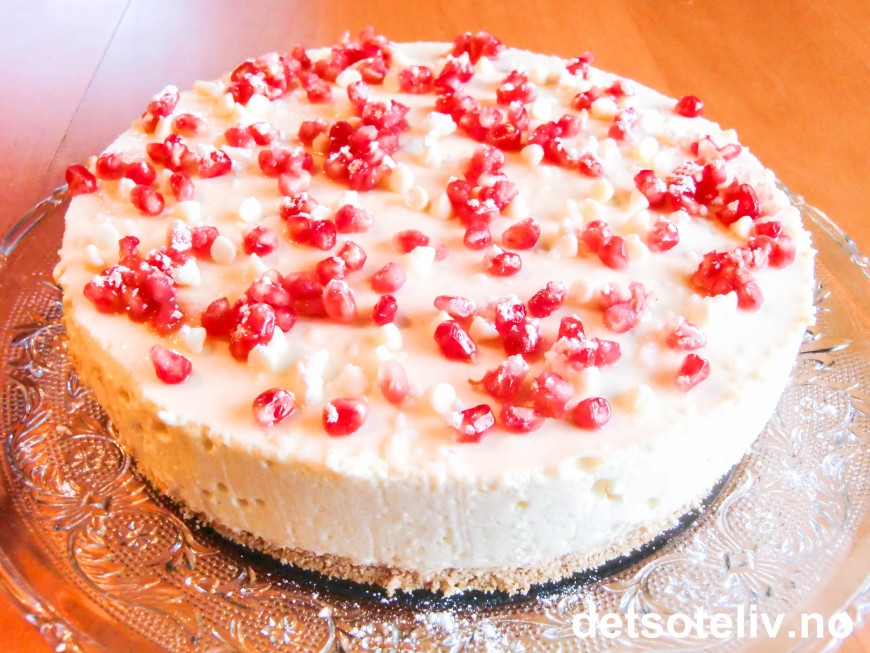 Løsne kakeringen fra kaken med en tynn, skarp kniv. Pynt kaken med hvit sjokolade (se tips), kjerner fra granateple og eventuelt et lite melisdryss helt til slutt.