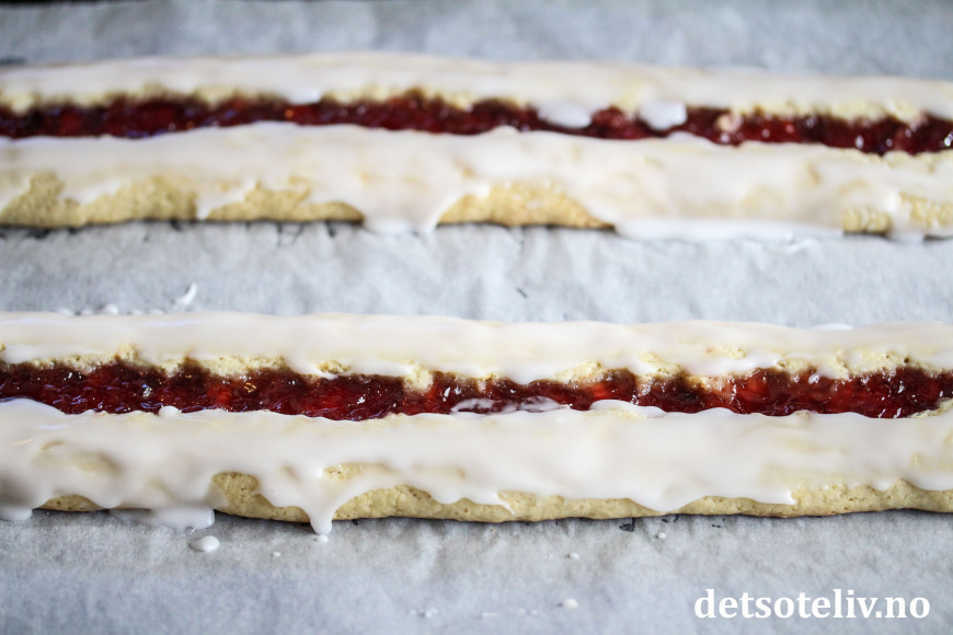 Ha ripsgeléen i en sprøytepose. Klipp et hull nederst i sprøyteposen og sprøyt en stripe ripsgelé i fordypningen på hver av lengdene.