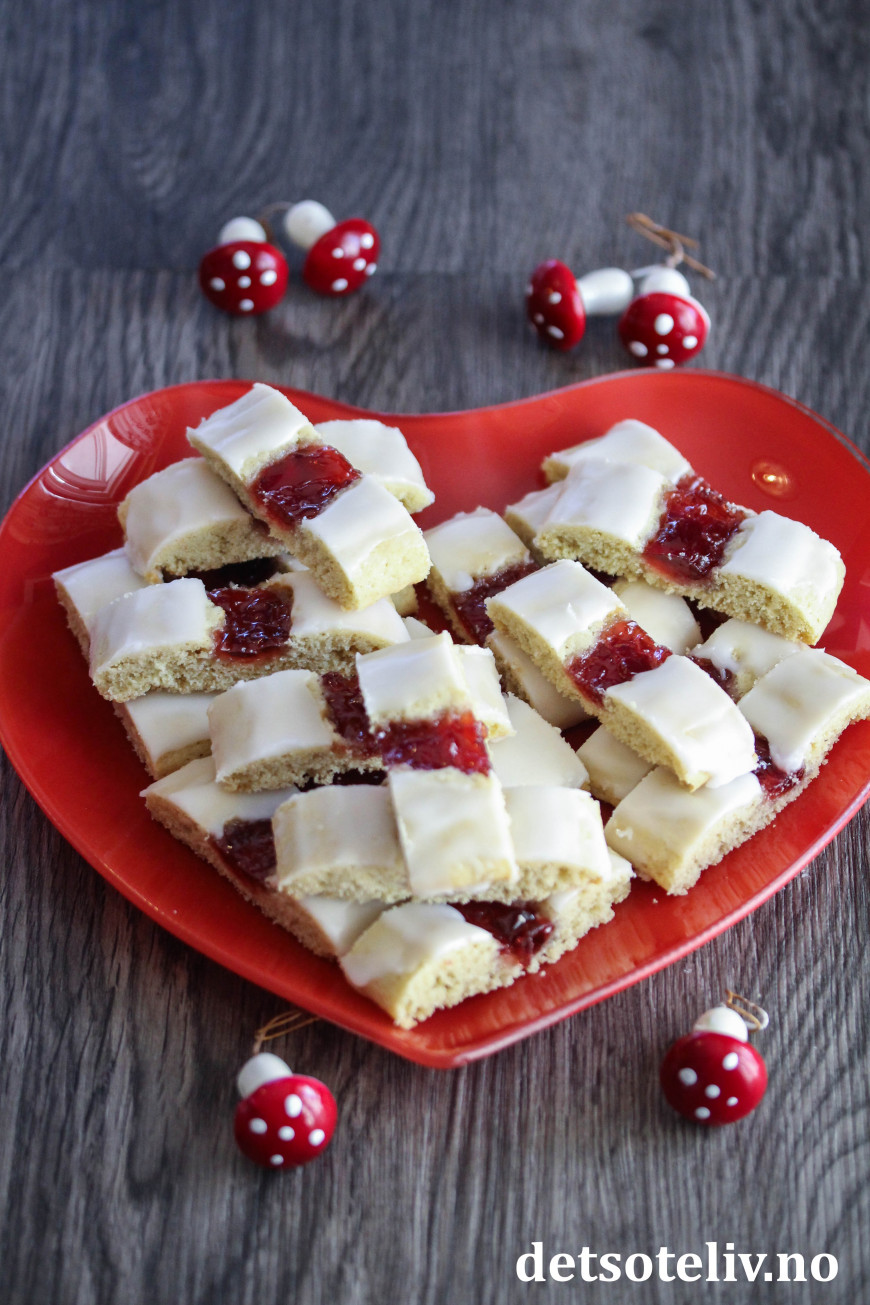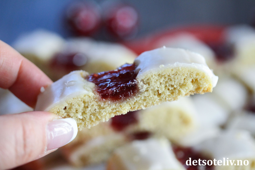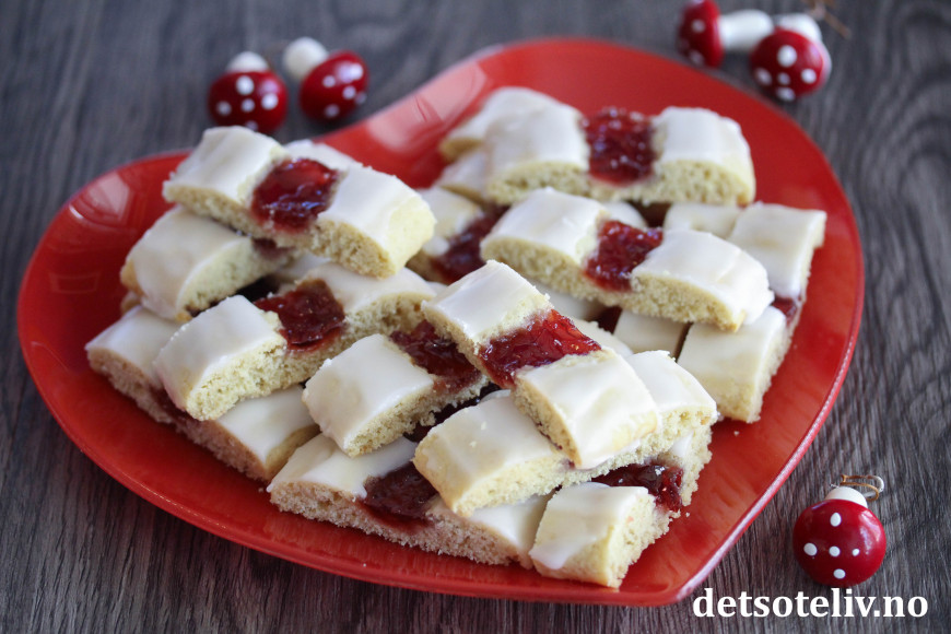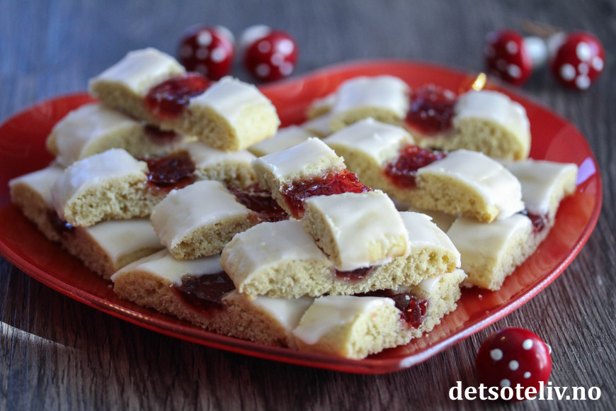 Kakene består av mørdeig som fylles med ripsgelé og som glaseres med melisglasur. Den røde fargen fra ripsgeléen gjør at kakene ser ekstra fine ut til jul.